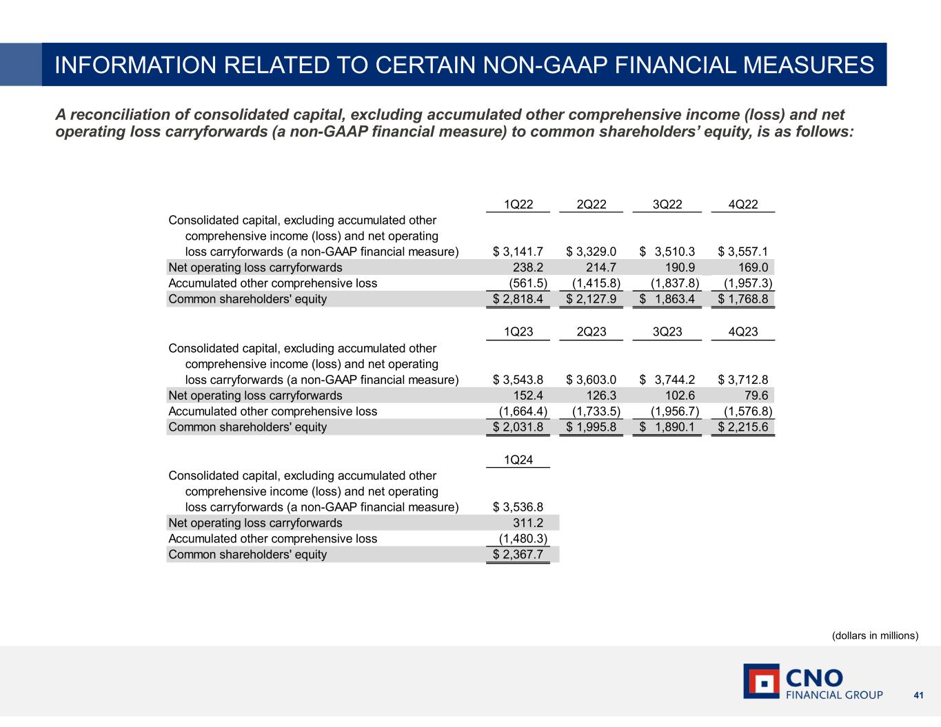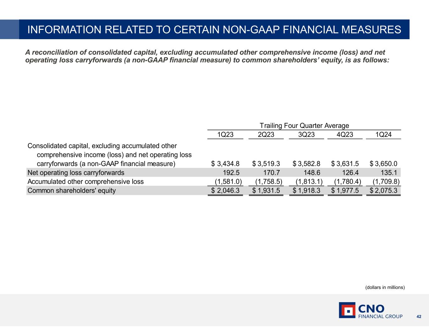 41 A reconciliation of consolidated capital, excluding accumulated other comprehensive income (loss) and net operating loss carryforwards (a non-GAAP financial measure) to common shareholders’ equity, is as follows: (dollars in millions) 1Q22 2Q22 3Q22 4Q22 Consolidated capital, excluding accumulated other comprehensive income (loss) and net operating loss carryforwards (a non-GAAP financial measure) 3,141.7$ 3,329.0$ 3,510.3$ 3,557.1$ Net operating loss carryforwards 238.2 214.7 190.9 169.0 Accumulated other comprehensive loss (561.5) (1,415.8) (1,837.8) (1,957.3) Common shareholders' equity 2,818.4$ 2,127.9$ 1,863.4$ 1,768.8$ 1Q23 2Q23 3Q23 4Q23 Consolidated capital, excluding accumulated other comprehensive income (loss) and net operating loss carryforwards (a non-GAAP financial measure) 3,543.8$ 3,603.0$ 3,744.2$ 3,712.8$ Net operating loss carryforwards 152.4 126.3 102.6 79.6 Accumulated other comprehensive loss (1,664.4) (1,733.5) (1,956.7) (1,576.8) Common shareholders' equity 2,031.8$ 1,995.8$ 1,890.1$ 2,215.6$ 1Q24 Consolidated capital, excluding accumulated other comprehensive income (loss) and net operating loss carryforwards (a non-GAAP financial measure) 3,536.8$ Net operating loss carryforwards 311.2 Accumulated other comprehensive loss (1,480.3) Common shareholders' equity 2,367.7$ INFORMATION RELATED TO CERTAIN NON-GAAP FINANCIAL MEASURES