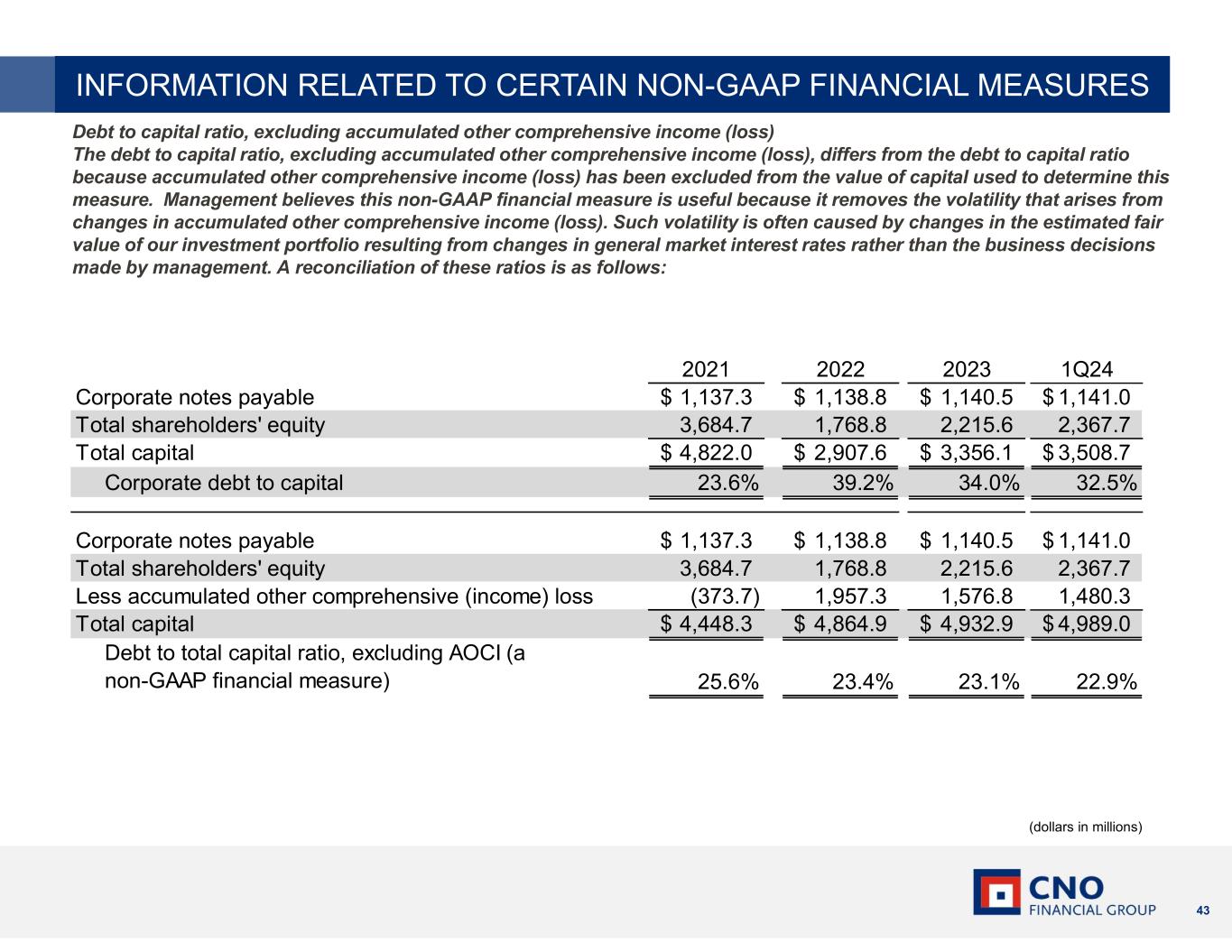 43 Debt to capital ratio, excluding accumulated other comprehensive income (loss) The debt to capital ratio, excluding accumulated other comprehensive income (loss), differs from the debt to capital ratio because accumulated other comprehensive income (loss) has been excluded from the value of capital used to determine this measure. Management believes this non-GAAP financial measure is useful because it removes the volatility that arises from changes in accumulated other comprehensive income (loss). Such volatility is often caused by changes in the estimated fair value of our investment portfolio resulting from changes in general market interest rates rather than the business decisions made by management. A reconciliation of these ratios is as follows: (dollars in millions) 2021 2022 2023 1Q24 Corporate notes payable 1,137.3$ 1,138.8$ 1,140.5$ 1,141.0$ Total shareholders' equity 3,684.7 1,768.8 2,215.6 2,367.7 Total capital 4,822.0$ 2,907.6$ 3,356.1$ 3,508.7$ Corporate debt to capital 23.6% 39.2% 34.0% 32.5% Corporate notes payable 1,137.3$ 1,138.8$ 1,140.5$ 1,141.0$ Total shareholders' equity 3,684.7 1,768.8 2,215.6 2,367.7 Less accumulated other comprehensive (income) loss (373.7) 1,957.3 1,576.8 1,480.3 Total capital 4,448.3$ 4,864.9$ 4,932.9$ 4,989.0$ Debt to total capital ratio, excluding AOCI (a non-GAAP financial measure) 25.6% 23.4% 23.1% 22.9% INFORMATION RELATED TO CERTAIN NON-GAAP FINANCIAL MEASURES
