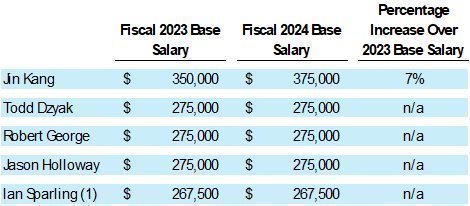 Base Salary. We pay our NEOs a base salary to compensate them for services rendered and to provide them with a steady source of income for living expenses throughout the year. During 2022, we entered into new employment agreements with Mr. Dzyak, Holloway and Sparling effective August 15, 2022 that increased their base salaries to $275,000 from $250,000, $265,000, and $220,000, respectively. Thereafter, each of our NEOs other than Ian Sparling voluntarily reduced their salaries by 10% from October 1, 2022 through December 31, 2022. The fiscal 2023 and projected fiscal 2024 salaries of our named executive officers and the percentage increases over their 2023 base salaries, if any, are as follows: