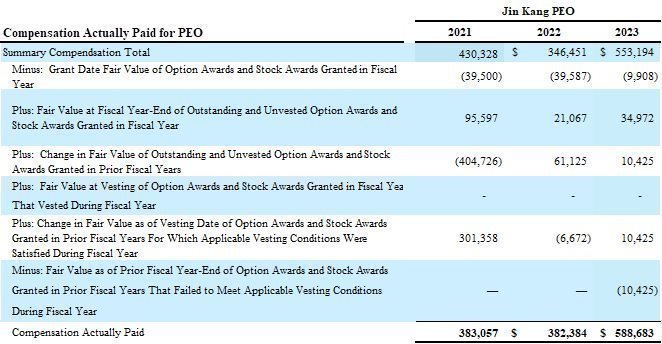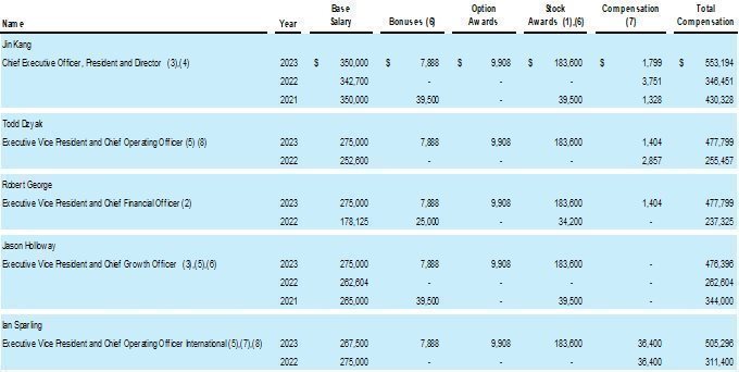 (1),(3) For each year represented, Jin Kang was our principal executive officer (“PEO”). Non-PEO NEOs for 2023 and 2022 were Todd Dzyak, Robert George, Jason Holloway and Ian Sparling and for 2021 they were Kellie Kim and Jason Holloway.
