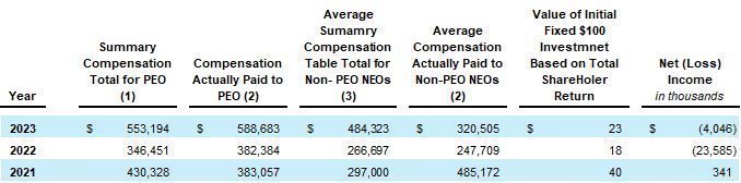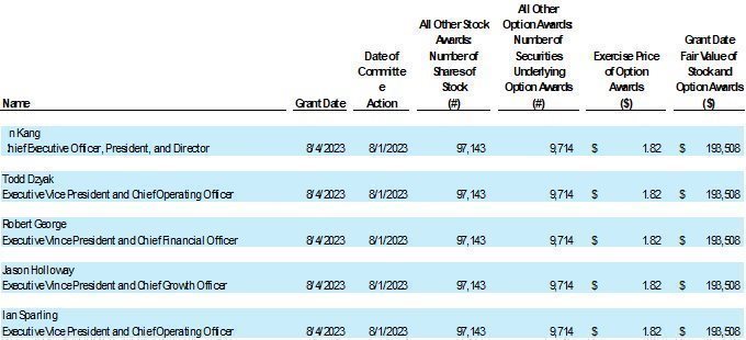 | (3) In 2021, Mr. Kang and Mr. Holloway each earned a $79,000 performance-based bonus due to the Company achieving certain financial goals. One-half of the bonus amount was paid in cash and one-half in restricted stock that was awarded in April 2022 vesting one year from the date of issuance (amounting to 11,575 shares). Amount represents the grant date fair value of the award made in 2022 as a result of 2021 performance.