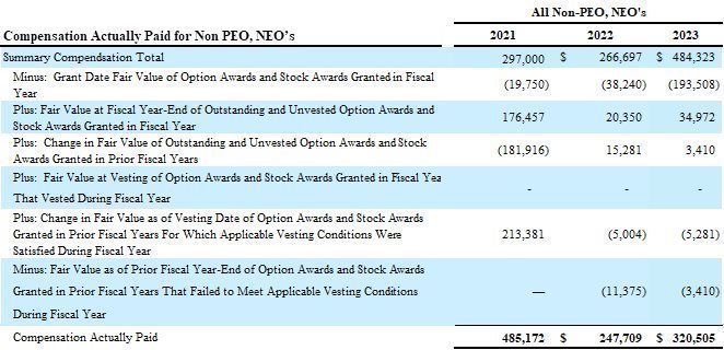 In 2023, each of our NEO’s had a target bonus of 50% of their base salary with the opportunity to earn a bonus of up to 100% of their base annual salary if they achieved certain financial targets of revenue and earnings before interest, taxes, depreciation and amortization (EBITDA). Each NEO earned a performance based bonus of $15,775. We expect to pay the bonus half in cash and the other half in restricted stock that vests in one year after the date of grant, subject to continued service with us.
