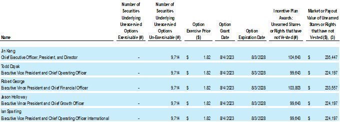 | Jin Kang | 7,500 shares of restricted stock, valued at $16,875 vested January 2, 2024 and 97,143 shares of restricted stock, valued at $218,572, vested on March 31, 2024 |