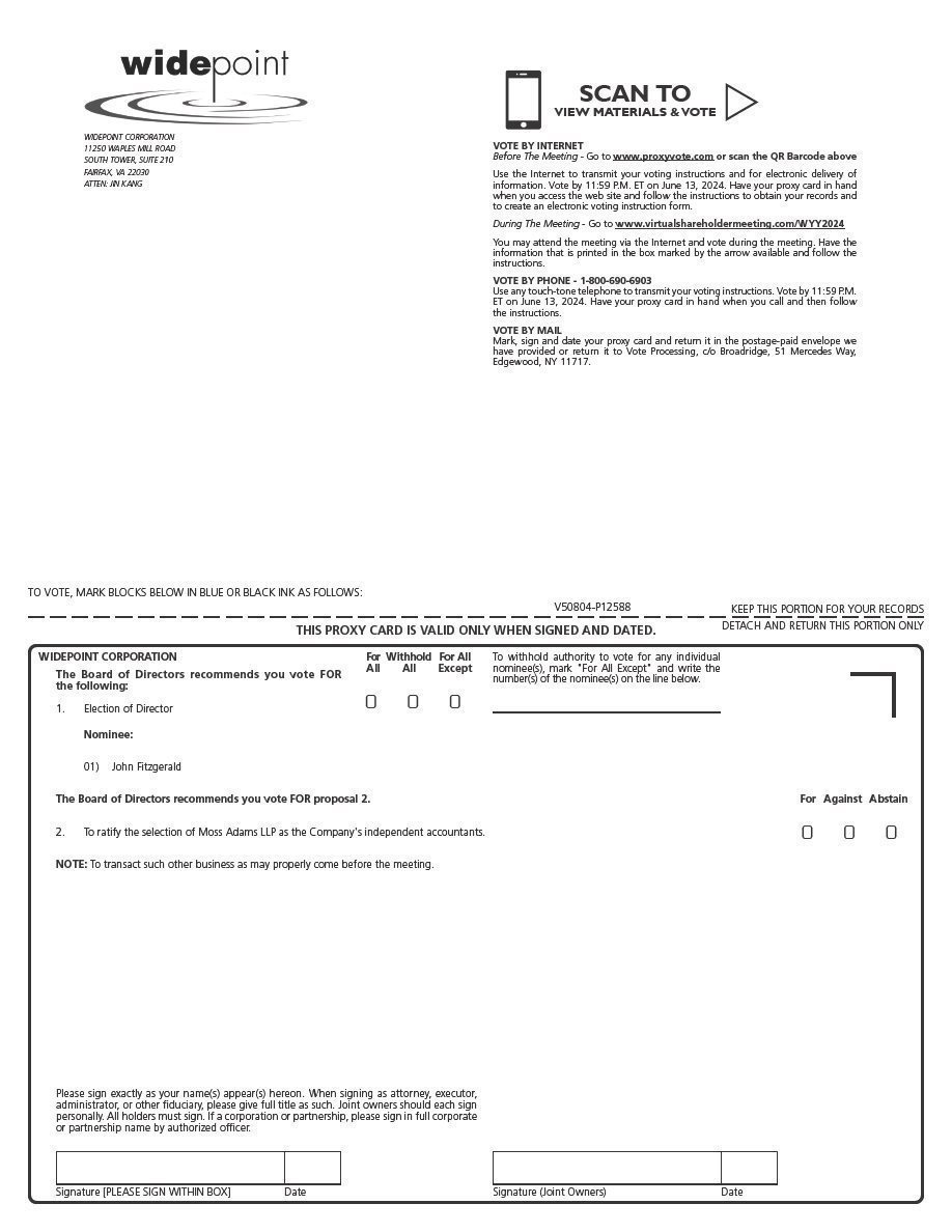 You are cordially invited to attend the 2024 Annual Meeting of Stockholders of WidePoint Corporation, which will convene at 10:00 a.m., EST, on Friday, June 14, 2024. To allow all of our stockholders to participate, we will have a completely virtual meeting of stockholders, which will be conducted solely online via live webcast. You will be able to participate in the annual meeting online, vote your shares electronically and submit your questions prior to and during the meeting by visiting: www.virtualshareholdermeeting.com/WYY2024. You must enter the control number found on your proxy card, voting instruction form or notice you previously received. There is no physical location for the annual meeting. As we have done in the past, we are taking advantage of the Securities and Exchange Commission's rule that allows companies to provide proxy materials for the annual meeting via the Internet to registered stockholders. The accompanying notice of meeting and proxy statement describe the matters to be voted on at the meeting.