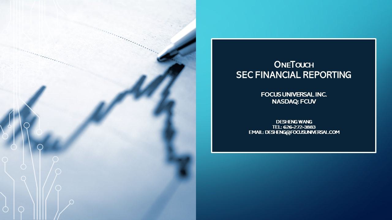 O NE T OUCH SEC FINANCIAL REPORTING FOCUS UNIVERSAL INC. NASDAQ : FCUV DESHENG WANG TEL: 626 - 272 - 3883 EMAIL: DESHENG@FOCUSUNIVERSAL.COM