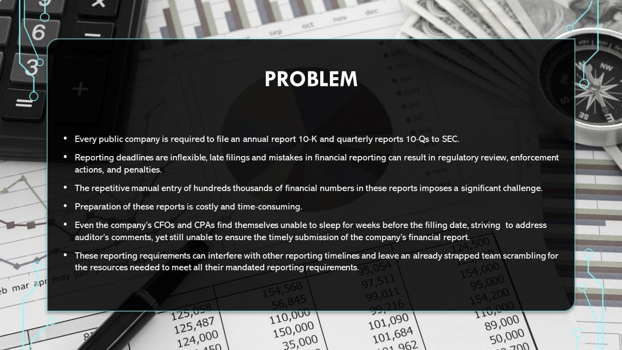 PROBLEM • Every public company is required to file an annual report 10 - K and quarterly reports 10 - Qs to SEC. • Reporting deadlines are inflexible, late filings and mistakes in financial reporting can result in regulatory review, enforce men t actions, and penalties. • The repetitive manual entry of hundreds thousands of financial numbers in these reports imposes a significant challenge. • Preparation of these reports is costly and time - consuming. • Even the compan y’s CFOs and CPAs find themselves unable to sleep for weeks before the filling date, striving to address auditor’s comments, yet still unable to ensure the timely submission of the company’s financial report. • These reporting requirements can interfere with other reporting timelines and leave an already strapped team scrambling for the resources needed to meet all their mandated reporting requirements.