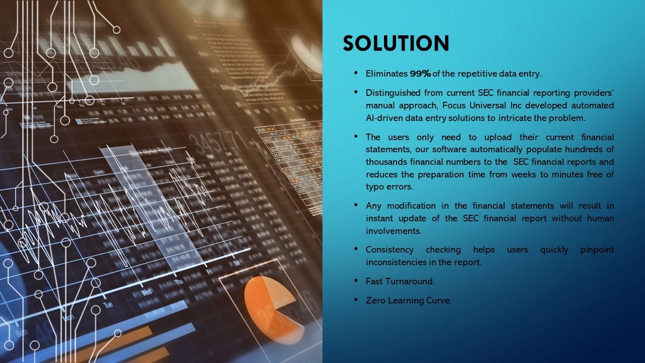 SOLUTION • Eliminates 99 % of the repetitive data entry . • Distinguished from current SEC financial reporting providers’ manual approach, Focus Universal Inc developed automated AI - driven data entry solutions to intricate the problem . • The users only need to upload their current financial statements, our software automatically populate hundreds of thousands financial numbers to the SEC financial reports and reduces the preparation time from weeks to minutes free of typo errors . • Any modification in the financial statements will result in instant update of the SEC financial report without human involvements . • Consistency checking helps users quickly pinpoint inconsistencies in the report . • Fast Turnaround . • Zero Learning Curve .