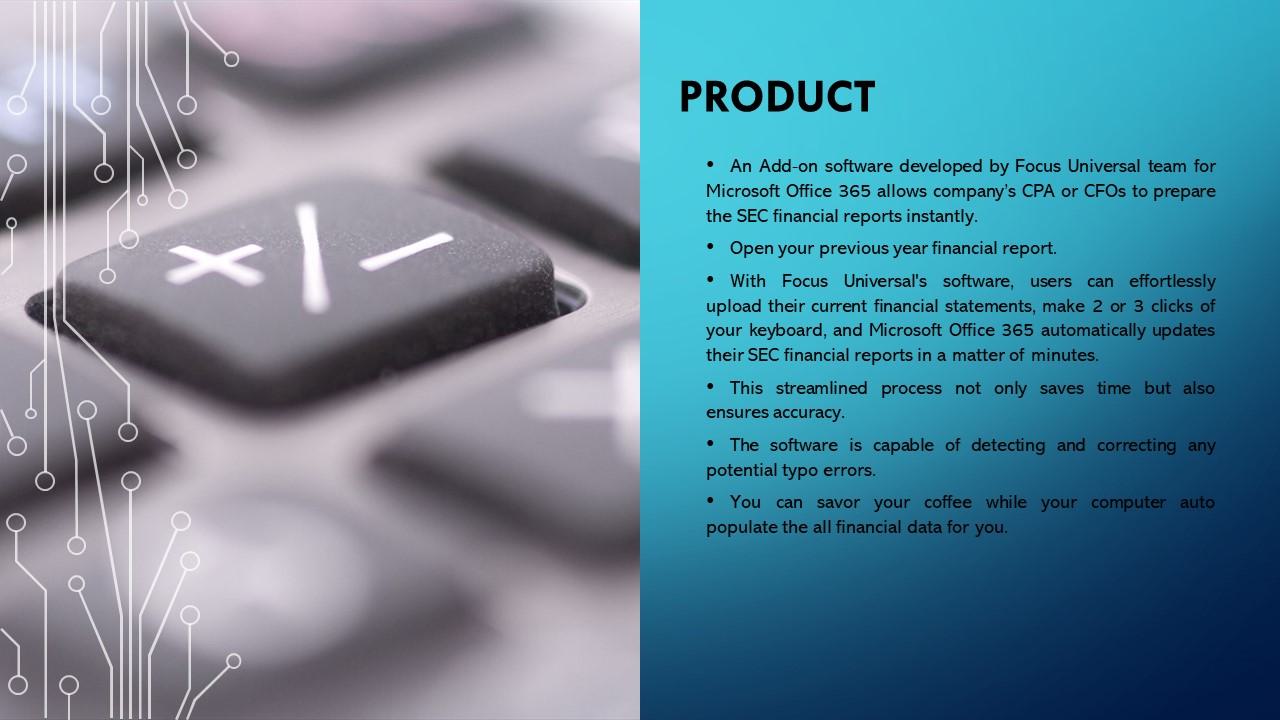 PRODUCT • An Add - on software developed by Focus Universal team for Microsoft Office 365 allows company’s CPA or CFOs to prepare the SEC financial reports instantly . • Open your previous year financial report . • With Focus Universal's software, users can effortlessly upload their current financial statements, make 2 or 3 clicks of your keyboard, and Microsoft Office 365 automatically updates their SEC financial reports in a matter of minutes . • This streamlined process not only saves time but also ensures accuracy . • T he software is capable of detecting and correcting any potential typo errors . • You can savor your coffee while your computer auto populate the all financial data for you .