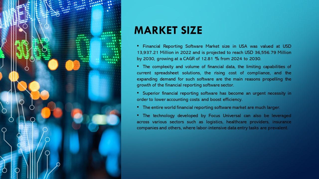 MARKET SIZE • Financial Reporting Software Market size in USA was valued at USD 13 , 937 . 21 Million in 2022 and is projected to reach USD 36 , 556 . 79 Million by 2030 , growing at a CAGR of 12 . 81 % from 2024 to 2030 . • The complexity and volume of financial data, the limiting capabilities of current spreadsheet solutions, the rising cost of compliance, and the expanding demand for such software are the main reasons propelling the growth of the financial reporting software sector . • Superior financial reporting software has become an urgent necessity in order to lower accounting costs and boost efficiency . • The entire world financial reporting software market are much larger . • The technology developed by Focus Universal can also be leveraged across various sectors such as logistics, healthcare providers, insurance companies and others, where labor - intensive data entry tasks are prevalent .