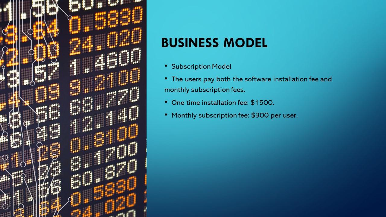 BUSINESS MODEL • Subscription Model • The users pay both the software installation fee and monthly subscription fees. • One time installation fee: $1500. • Monthly subscription fee: $300 per user.