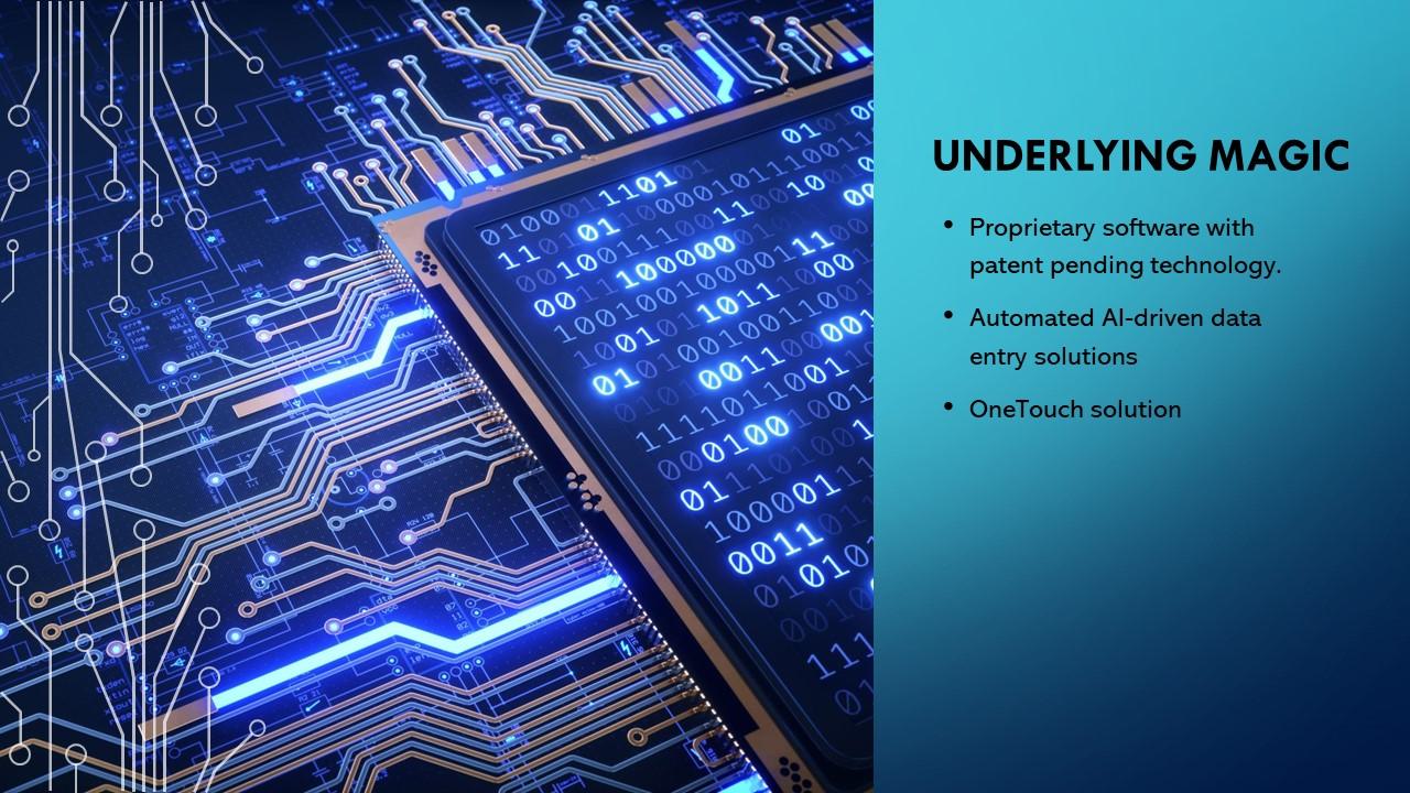 UNDERLYING MAGIC • Proprietary software with patent pending technology. • A utomated AI - driven data entry solutions • OneTouch solution