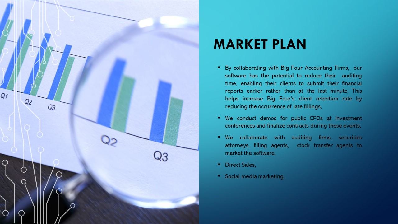 MARKET PLAN • By collaborating with Big Four Accounting Firms, our software has the potential to reduce their auditing time, enabling their clients to submit their financial reports earlier rather than at the last minute, This helps increase Big Four’s client retention rate by reducing the occurrence of late fillings, • We conduct demos for public CFOs at investment conferences and finalize contracts during these events, • We collaborate with auditing firms, securities attorneys, filling agents, stock transfer agents to market the software, • Direct Sales, • Social media marketing .