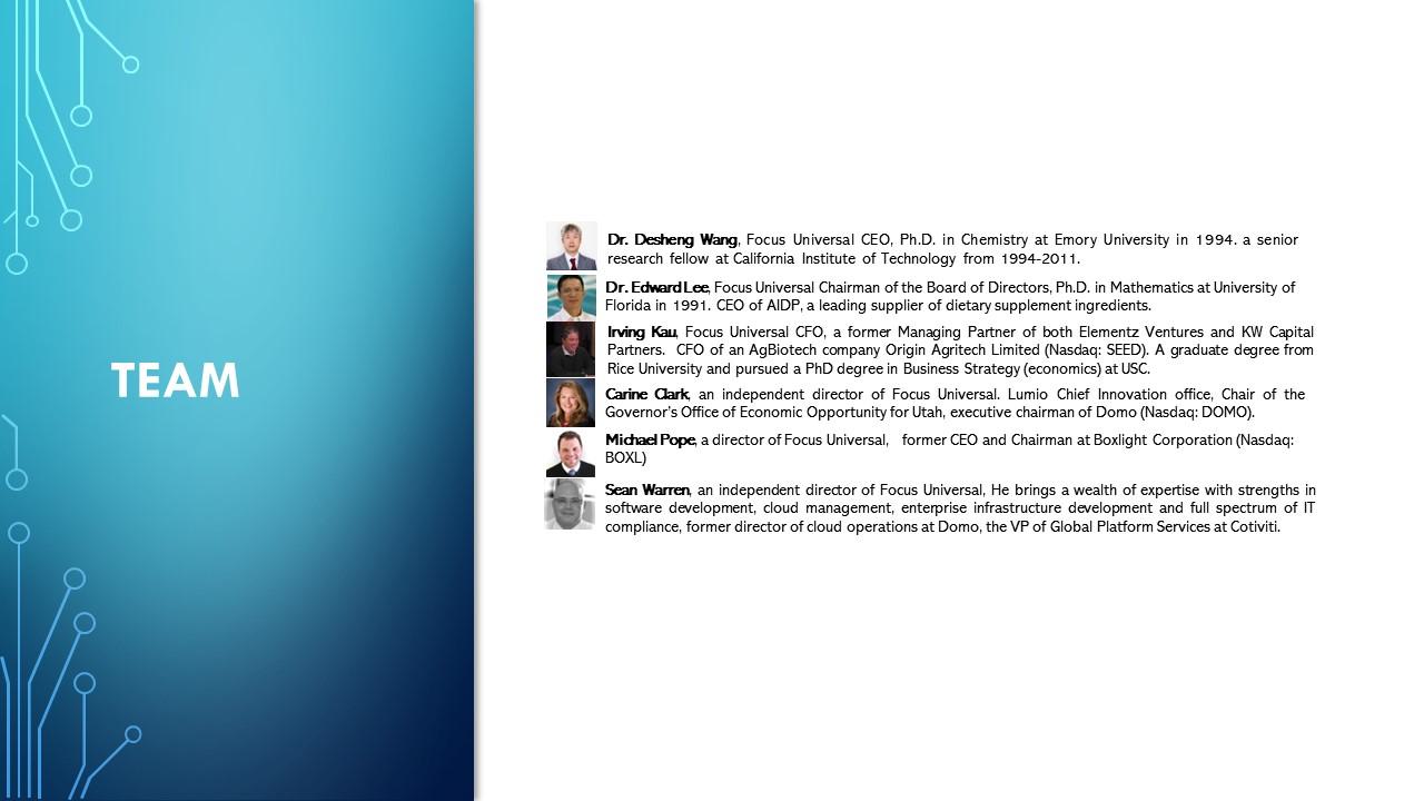 TEAM Dr . Desheng Wang , Focus Universal CEO, Ph . D . in Chemistry at Emory University in 1994 . a senior research fellow at California Institute of Technology from 1994 - 2011 . Dr. Edward Lee , Focus Universal Chairman of the Board of Directors, Ph.D. in Mathematics at University of Florida in 1991. CEO of AIDP, a leading supplier of dietary supplement ingredients. Irving Kau , Focus Universal CFO, a former Managing Partner of both Elementz Ventures and KW Capital Partners . CFO of an AgBiotech company Origin Agritech Limited (Nasdaq : SEED) . A graduate degree from Rice University and pursued a PhD degree in Business Strategy (economics) at USC . Carine Clark , an independent director of Focus Universal . Lumio Chief Innovation office, Chair of the Governor’s Office of Economic Opportunity for Utah, executive chairman of Domo (Nasdaq : DOMO) . Michael Pope , a director of Focus Universal, former CEO and Chairman at Boxlight Corporation (Nasdaq: BOXL) Sean Warren , an independent director of Focus Universal, He brings a wealth of expertise with strengths in software development, cloud management, enterprise infrastructure development and full spectrum of IT compliance, former director of cloud operations at Domo, the VP of Global Platform Services at Cotiviti . FU1
