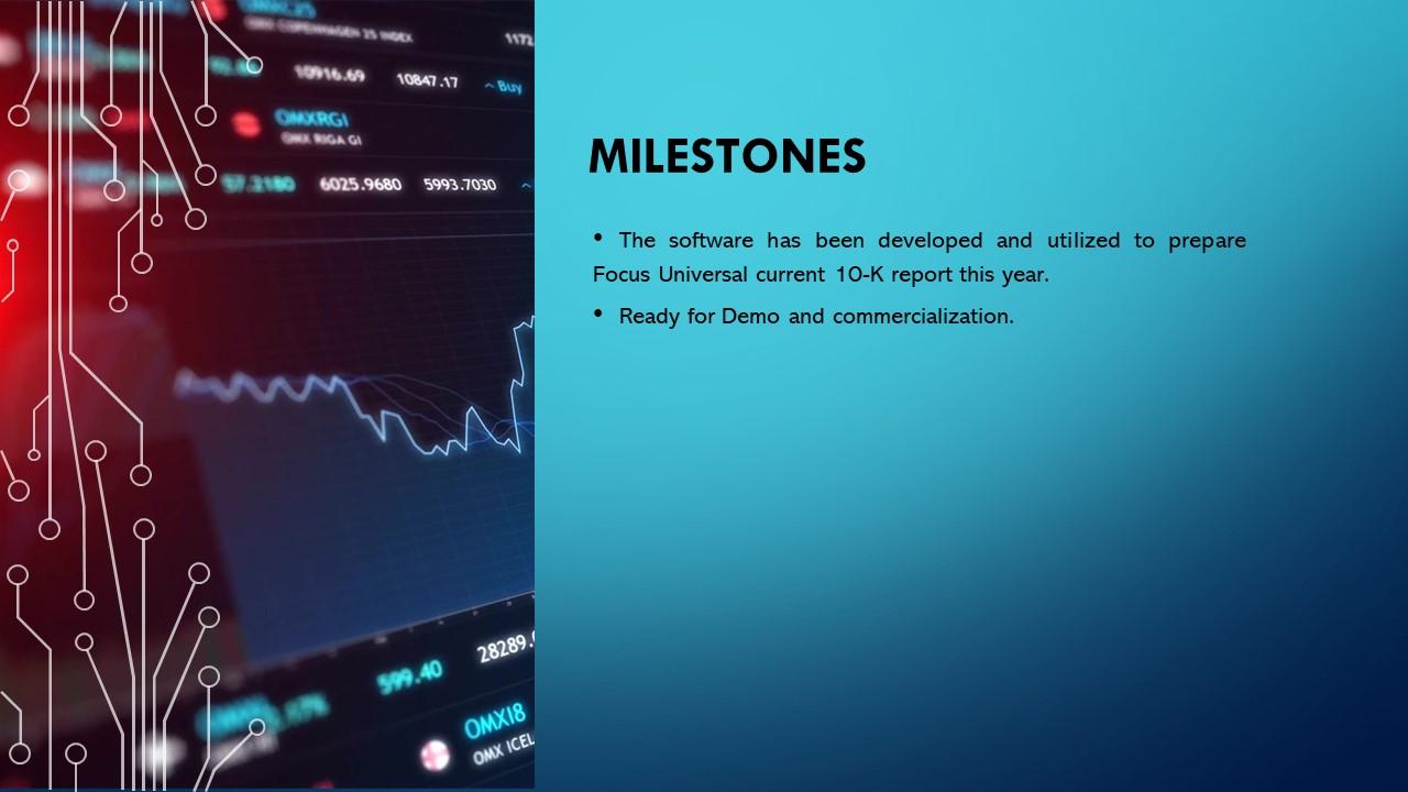 MILESTONES • The software has been developed and utilized to prepare Focus Universal current 10 - K report this year . • Ready for Demo and commercialization .