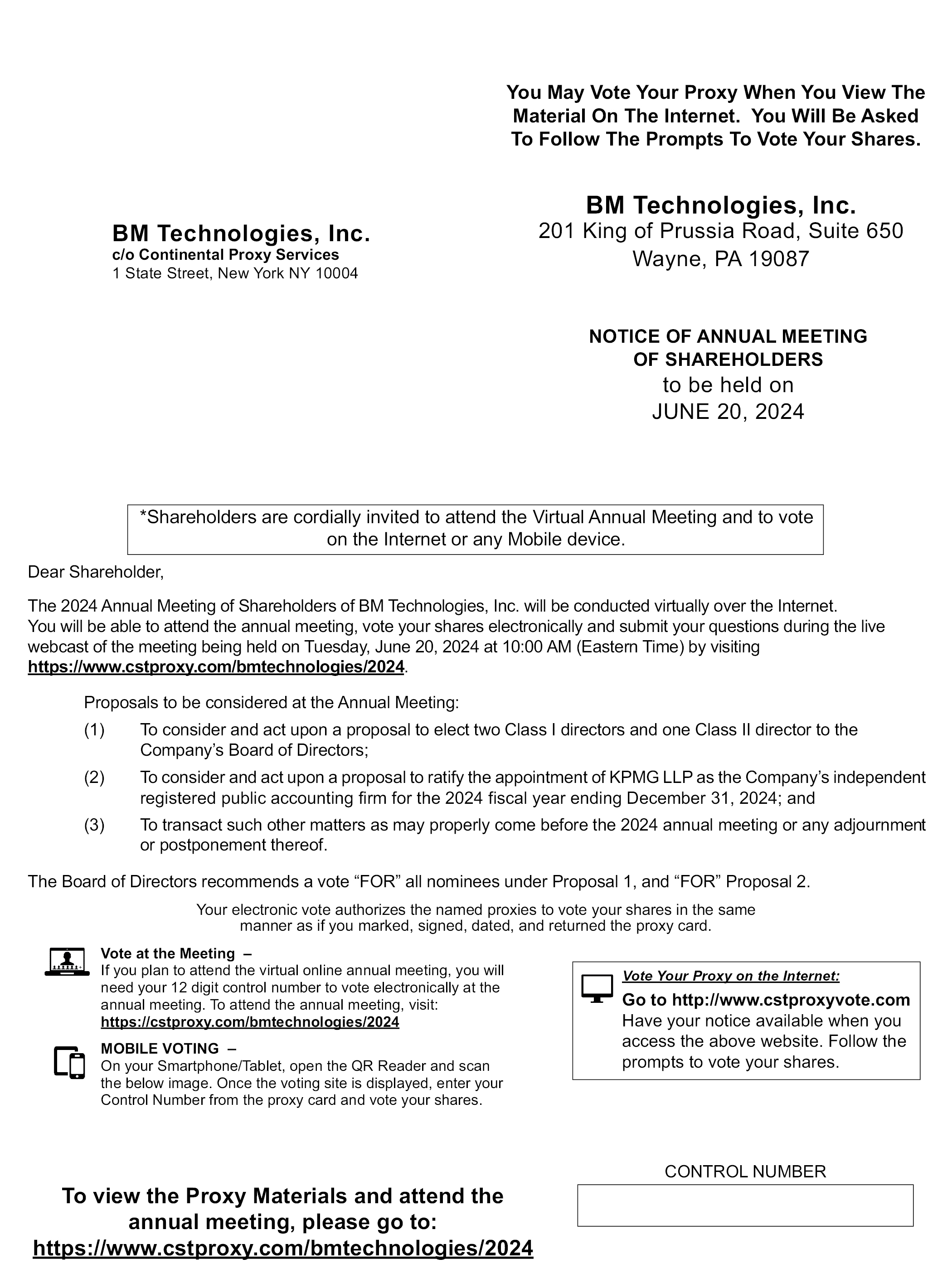 You May Vote Your Proxy When You View The Material On The Internet. You Will Be Asked To Follow The Prompts To Vote Your Shares. BM Technologies, Inc. c/o Continental Proxy Services 1 State Street, New York NY 10004 BM Technologies, Inc. 201 King of Prussia Road, Suite 650 Wayne, PA 19087 NOTICE OF ANNUAL MEETING OF SHAREHOLDERS to be held on JUNE 20, 2024 *Shareholders are cordially invited to attend the Virtual Annual Meeting and to vote on the Internet or any Mobile device. Dear Shareholder, The 2024 Annual Meeting of Shareholders of BM Technologies, Inc. will be conducted virtually over the Internet. You will be able to attend the annual meeting, vote your shares electronically and submit your questions during the live webcast of the meeting being held on Tuesday, June 20, 2024 at 10:00 AM (Eastern Time) by visiting https://www.cstproxy.com/bmtechnologies/2024. Proposals to be considered at the Annual Meeting: (1) To consider and act upon a proposal to elect two Class I directors and one Class II director to the Company’s Board of Directors; (2) To consider and act upon a proposal to ratify the appointment of KPMG LLP as the Company’s independent registered public accounting firm for the 2024 fiscal year ending December 31, 2024; and (3) To transact such other matters as may properly come before the 2024 annual meeting or any adjournment or postponement thereof. The Board of Directors recommends a vote “FOR” all nominees under Proposal 1, and “FOR” Proposal 2. Your electronic vote authorizes the named proxies to vote your shares in the same manner as if you marked, signed, dated, and returned the proxy card. Vote at the Meeting – Vote Your Proxy on the Internet: Go to http://www.cstproxyvote.com Have your notice available when you access the above website. Follow the prompts to vote your shares. If you plan to attend the virtual online annual meeting, you will need your 12 digit control number to vote electronically at the annual meeting. To attend the annual meeting, visit: https://cstproxy.com/bmtechnologies/2024 MOBILE VOTING – On your Smartphone/Tablet, open the QR Reader and scan the below image. Once the voting site is displayed, enter your Control Number from the proxy card and vote your shares. CONTROL NUMBER To view the Proxy Materials and attend the annual meeting, please go to: https://www.cstproxy.com/bmtechnologies/2024