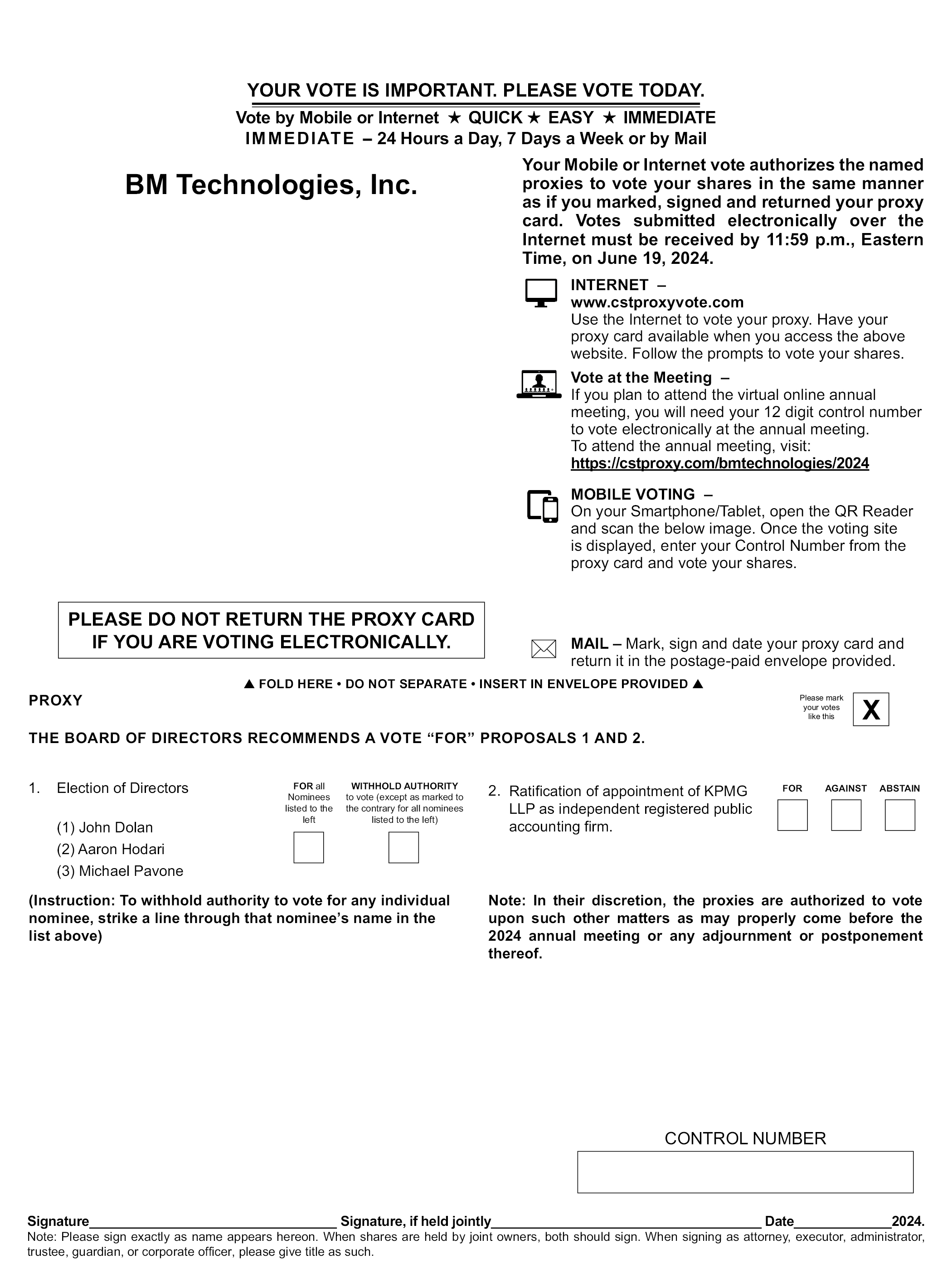 YOUR VOTE IS IMPORTANT. PLEASE VOTE TODAY. Vote by Mobile or Internet * QUICK * EASY * IMMEDIATE IMMEDIATE - 24 Hours a Day, 7 Days a Week or by Mail BM Technologies, Inc. Your Mobile or Internet vote authorizes the named proxies to vote your shares in the same manner as if you marked, signed and returned your proxy card. Votes submitted electronically over the Internet must be received by 11:59 p.m., Eastern Time, on June 19, 2024. INTERNET – www.cstproxyvote.com Use the Internet to vote your proxy. Have your proxy card available when you access the above website. Follow the prompts to vote your shares. Vote at the Meeting – If you plan to attend the virtual online annual meeting, you will need your 12 digit control number to vote electronically at the annual meeting. To attend the annual meeting, visit: https://cstproxy.com/bmtechnologies/2024 MOBILE VOTING – On your Smartphone/Tablet, open the QR Reader and scan the below image. Once the voting site is displayed, enter your Control Number from the proxy card and vote your shares. PLEASE DO NOT RETURN THE PROXY CARD IF YOU ARE VOTING ELECTRONICALLY. MAIL – Mark, sign and date your proxy card and return it in the postage-paid envelope provided. FOLD HERE • DO NOT SEPARATE • INSERT IN ENVELOPE PROVIDED PROXY Please mark your votes like this THE BOARD OF DIRECTORS RECOMMENDS A VOTE “FOR” PROPOSALS 1 AND 2. Election of Directors FOR all Nominees listed to the left WITHHOLD AUTHORITY to vote (except as marked to the contrary for all nominees listed to the left) Ratification of appointment of KPMG LLP as independent registered public accounting firm. AGAINST ABSTAIN John Dolan Aaron Hodari Michael Pavone (Instruction: To withhold authority to vote for any individual nominee, strike a line through that nominee’s name in the list above) Note: In their discretion, the proxies are authorized to vote upon such other matters as may properly come before the 2024 annual meeting or any adjournment or postponement thereof. CONTROL NUMBER Signature_________________________________ Signature, if held jointly____________________________________ Date_____________2024. Note: Please sign exactly as name appears hereon. When shares are held by joint owners, both should sign. When signing as attorney, executor, administrator, trustee, guardian, or corporate officer, please give title as such.