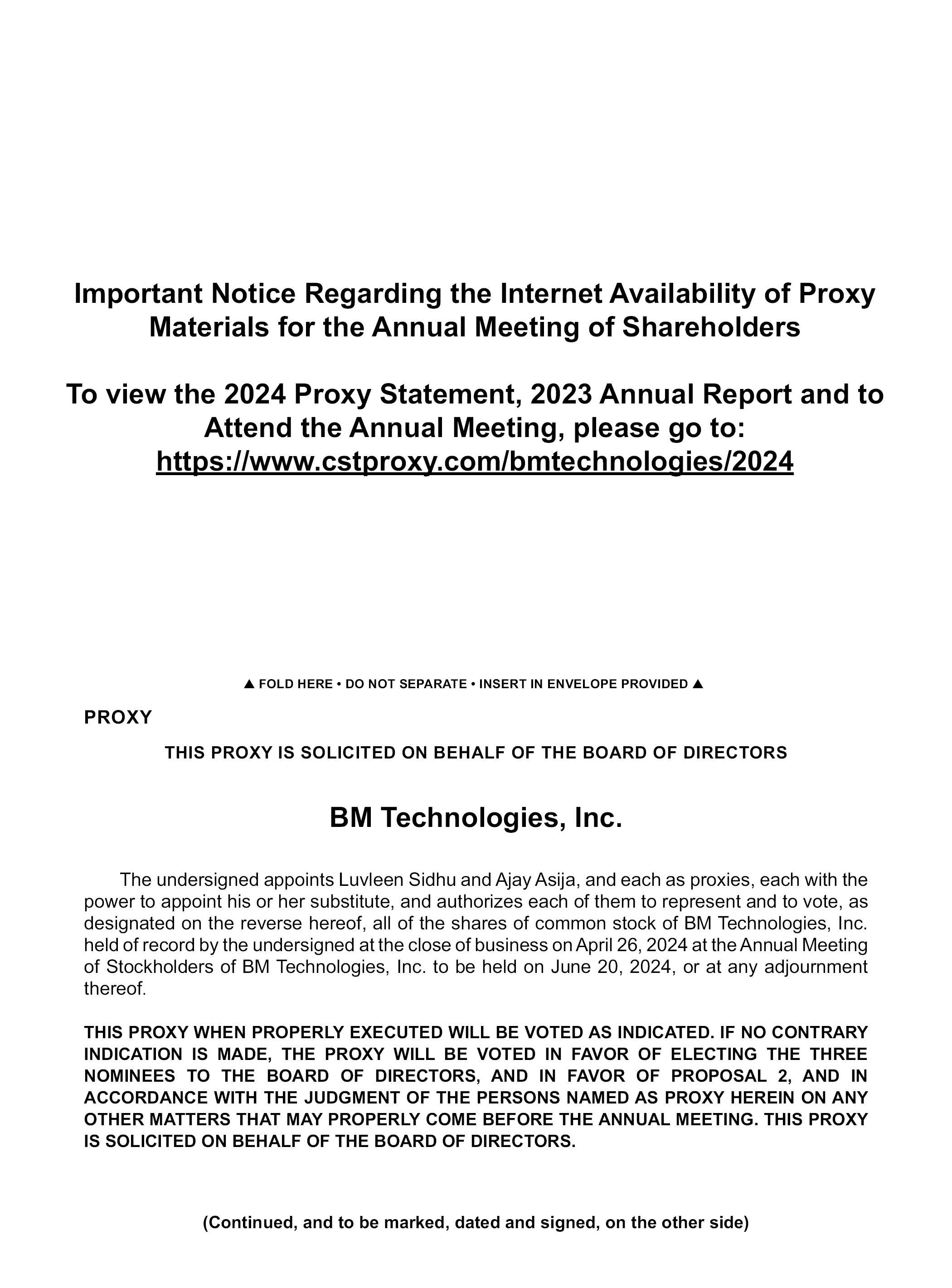 Important Notice Regarding the Internet Availability of Proxy Materials for the Annual Meeting of Shareholders To view the 2024 Proxy Statement, 2023 Annual Report and to Attend the Annual Meeting, please go to: https://www.cstproxy.com/bmtechnologies/2024 FOLD HERE • DO NOT SEPARATE • INSERT IN ENVELOPE PROVIDED PROXY THIS PROXY IS SOLICITED ON BEHALF OF THE BOARD OF DIRECTORS BM Technologies, Inc. The undersigned appoints Luvleen Sidhu and Ajay Asija, and each as proxies, each with the power to appoint his or her substitute, and authorizes each of them to represent and to vote, as designated on the reverse hereof, all of the shares of common stock of BM Technologies, Inc. held of record by the undersigned at the close of business on April 26, 2024 at the Annual Meeting of Stockholders of BM Technologies, Inc. to be held on June 20, 2024, or at any adjournment thereof. THIS PROXY WHEN PROPERLY EXECUTED WILL BE VOTED AS INDICATED. IF NO CONTRARY INDICATION IS MADE, THE PROXY WILL BE VOTED IN FAVOR OF ELECTING THE THREE NOMINEES TO THE BOARD OF DIRECTORS, AND IN FAVOR OF PROPOSAL 2, AND IN ACCORDANCE WITH THE JUDGMENT OF THE PERSONS NAMED AS PROXY HEREIN ON ANY OTHER MATTERS THAT MAY PROPERLY COME BEFORE THE ANNUAL MEETING. THIS PROXY IS SOLICITED ON BEHALF OF THE BOARD OF DIRECTORS. (Continued, and to be marked, dated and signed, on the other side)