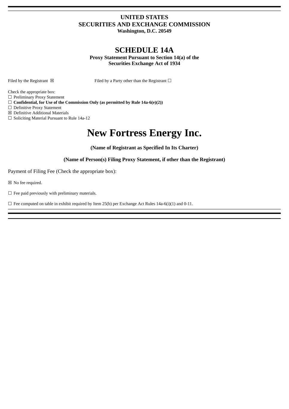 UNITED STATES SECURITIES AND EXCHANGE COMMISSION Washington, D.C. 20549 SCHEDULE 14A Proxy Statement Pursuant to Section 14(a) of the Securities Exchange Act of 1934 Filed by the Registrant ☒ Filed by a Party other than the Registrant ☐ Check the appropriate box: ☐ Preliminary Proxy Statement ☐ Confidential, for Use of the Commission Only (as permitted by Rule 14a-6(e)(2)) ☐ Definitive Proxy Statement ☒ Definitive Additional Materials ☐ Soliciting Material Pursuant to Rule 14a-12 New Fortress Energy Inc. (Name of Registrant as Specified In Its Charter) (Name of Person(s) Filing Proxy Statement, if other than the Registrant) Payment of Filing Fee (Check the appropriate box): ☒ No fee required. ☐ Fee paid previously with preliminary materials. ☐ Fee computed on table in exhibit required by Item 25(b) per Exchange Act Rules 14a-6(i)(1) and 0-11.
