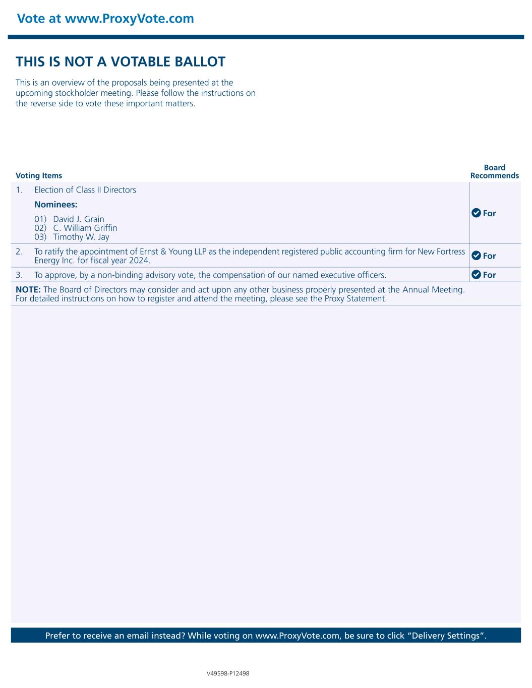 THIS IS NOT A VOTABLE BALLOT This is an overview of the proposals being presented at the upcoming stockholder meeting. Please follow the instructions on the reverse side to vote these important matters. Vote at www.ProxyVote.com Prefer to receive an email instead? While voting on www.ProxyVote.com, be sure to click “Delivery Settings”. V49598-P12498 Voting Items Board Recommends 1. Election of Class II Directors For Nominees: 01) David J. Grain 02) C. William Griffin 03) Timothy W. Jay 2. To ratify the appointment of Ernst & Young LLP as the independent registered public accounting firm for New Fortress Energy Inc. for fiscal year 2024. For 3. To approve, by a non-binding advisory vote, the compensation of our named executive officers. For NOTE: The Board of Directors may consider and act upon any other business properly presented at the Annual Meeting. For detailed instructions on how to register and attend the meeting, please see the Proxy Statement.