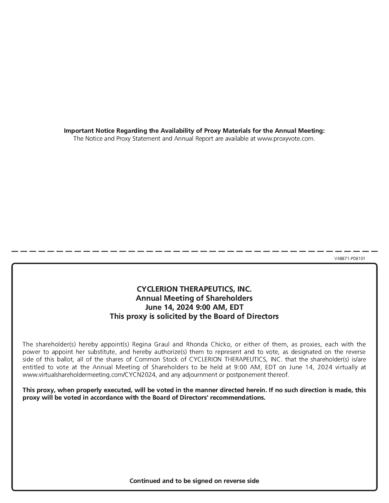 PLACE: | | | This year’s Annual Meeting of Shareholders (the “Annual Meeting”) of Cyclerion Therapeutics, Inc. (the “Company”) will be a virtual meeting, which will be conducted only via live webcast. Shareholders will only be able to participate in the Annual Meeting online, vote shares electronically and submit questions during the Annual Meeting by visiting www.virtualshareholdermeeting.com/CYCN2024. Instructions on how to attend the Annual Meeting online and vote shares are described in the accompanying materials. |
