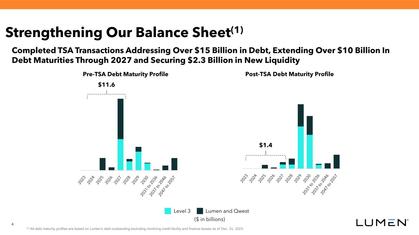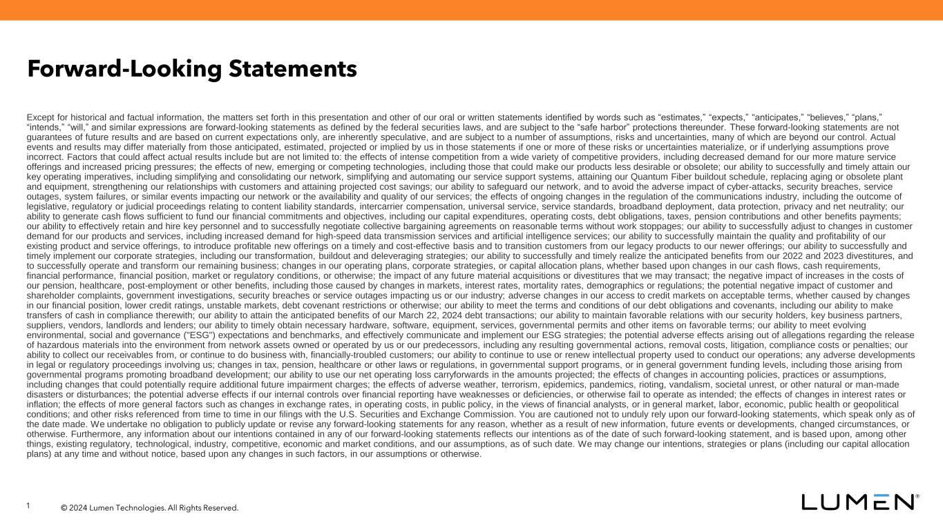 © 2024 Lumen Technologies. All Rights Reserved. 1 Forward-Looking Statements Except for historical and factual information, the matters set forth in this presentation and other of our oral or written statements identified by words such as “estimates,” “expects,” “anticipates,” “believes,” “plans,” “intends,” “will,” and similar expressions are forward-looking statements as defined by the federal securities laws, and are subject to the “safe harbor” protections thereunder. These forward-looking statements are not guarantees of future results and are based on current expectations only, are inherently speculative, and are subject to a number of assumptions, risks and uncertainties, many of which are beyond our control. Actual events and results may differ materially from those anticipated, estimated, projected or implied by us in those statements if one or more of these risks or uncertainties materialize, or if underlying assumptions prove incorrect. Factors that could affect actual results include but are not limited to: the effects of intense competition from a wide variety of competitive providers, including decreased demand for our more mature service offerings and increased pricing pressures; the effects of new, emerging or competing technologies, including those that could make our products less desirable or obsolete; our ability to successfully and timely attain our key operating imperatives, including simplifying and consolidating our network, simplifying and automating our service support systems, attaining our Quantum Fiber buildout schedule, replacing aging or obsolete plant and equipment, strengthening our relationships with customers and attaining projected cost savings; our ability to safeguard our network, and to avoid the adverse impact of cyber-attacks, security breaches, service outages, system failures, or similar events impacting our network or the availability and quality of our services; the effects of ongoing changes in the regulation of the communications industry, including the outcome of legislative, regulatory or judicial proceedings relating to content liability standards, intercarrier compensation, universal service, service standards, broadband deployment, data protection, privacy and net neutrality; our ability to generate cash flows sufficient to fund our financial commitments and objectives, including our capital expenditures, operating costs, debt obligations, taxes, pension contributions and other benefits payments; our ability to effectively retain and hire key personnel and to successfully negotiate collective bargaining agreements on reasonable terms without work stoppages; our ability to successfully adjust to changes in customer demand for our products and services, including increased demand for high-speed data transmission services and artificial intelligence services; our ability to successfully maintain the quality and profitability of our existing product and service offerings, to introduce profitable new offerings on a timely and cost-effective basis and to transition customers from our legacy products to our newer offerings; our ability to successfully and timely implement our corporate strategies, including our transformation, buildout and deleveraging strategies; our ability to successfully and timely realize the anticipated benefits from our 2022 and 2023 divestitures, and to successfully operate and transform our remaining business; changes in our operating plans, corporate strategies, or capital allocation plans, whether based upon changes in our cash flows, cash requirements, financial performance, financial position, market or regulatory conditions, or otherwise; the impact of any future material acquisitions or divestitures that we may transact; the negative impact of increases in the costs of our pension, healthcare, post-employment or other benefits, including those caused by changes in markets, interest rates, mortality rates, demographics or regulations; the potential negative impact of customer and shareholder complaints, government investigations, security breaches or service outages impacting us or our industry; adverse changes in our access to credit markets on acceptable terms, whether caused by changes in our financial position, lower credit ratings, unstable markets, debt covenant restrictions or otherwise; our ability to meet the terms and conditions of our debt obligations and covenants, including our ability to make transfers of cash in compliance therewith; our ability to attain the anticipated benefits of our March 22, 2024 debt transactions; our ability to maintain favorable relations with our security holders, key business partners, suppliers, vendors, landlords and lenders; our ability to timely obtain necessary hardware, software, equipment, services, governmental permits and other items on favorable terms; our ability to meet evolving environmental, social and governance ("ESG") expectations and benchmarks, and effectively communicate and implement our ESG strategies; the potential adverse effects arising out of allegations regarding the release of hazardous materials into the environment from network assets owned or operated by us or our predecessors, including any resulting governmental actions, removal costs, litigation, compliance costs or penalties; our ability to collect our receivables from, or continue to do business with, financially-troubled customers; our ability to continue to use or renew intellectual property used to conduct our operations; any adverse developments in legal or regulatory proceedings involving us; changes in tax, pension, healthcare or other laws or regulations, in governmental support programs, or in general government funding levels, including those arising from governmental programs promoting broadband development; our ability to use our net operating loss carryforwards in the amounts projected; the effects of changes in accounting policies, practices