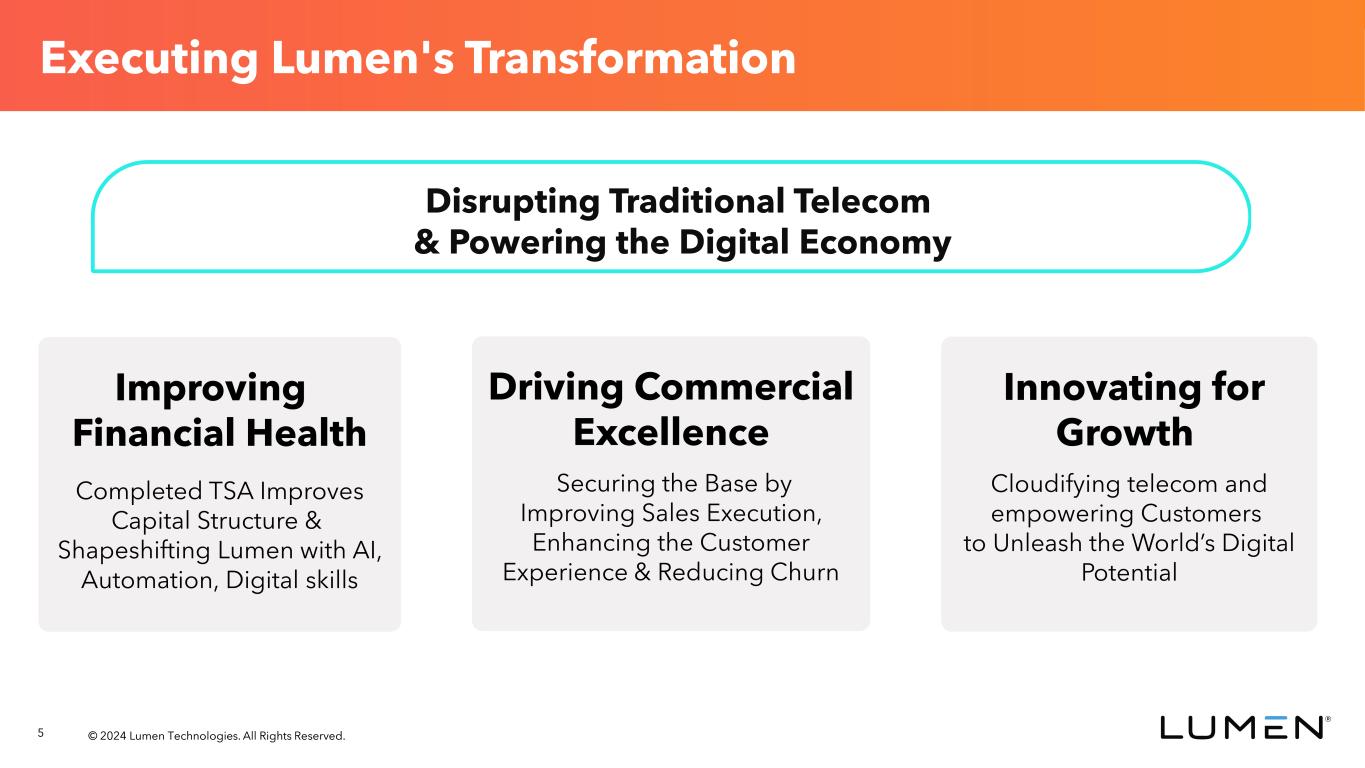 © 2024 Lumen Technologies. All Rights Reserved. 2 Non-GAAP Measures This presentation includes certain historical and forward-looking non-GAAP financial measures, including but not limited to adjusted EBITDA, adjusted EBITDA margin, and free cash flow, each excluding the effects of special items, and adjustments to GAAP and other non-GAAP measures to exclude the effect of special items. In addition to providing key metrics for management to evaluate the company’s performance, we believe these measurements assist investors in their understanding of period-to-period operating performance and in identifying historical and prospective trends. Reconciliations of non-GAAP financial measures to the most comparable GAAP measures are included in the financial schedules to the Company’s accompanying earnings release. Reconciliation of information and additional non-GAAP historical financial measures that may be discussed during the call, along with further descriptions of non-GAAP financial measures, will be available in the Investor Relations portion of the company’s website at http://ir.lumen.com. Non-GAAP measures are not presented to be replacements or alternatives to the GAAP measures, and investors are urged to consider these non-GAAP measures in addition to, and not in substitution for, measures prepared in accordance with GAAP. Lumen may present or calculate its non-GAAP measures differently from other companies.