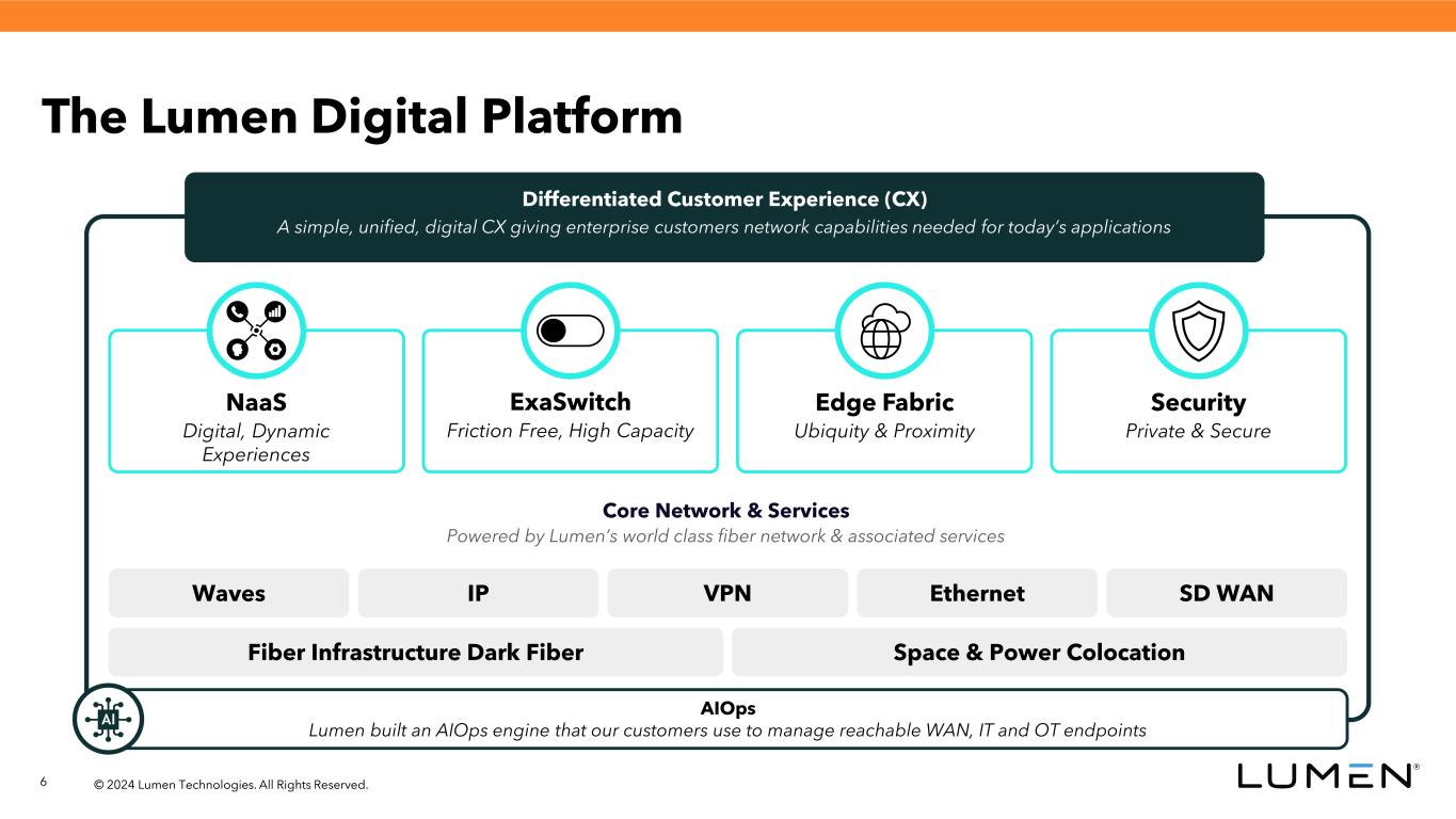© 2024 Lumen Technologies. All Rights Reserved. 5 Slide Title Disrupting Traditional Telecom & Powering the Digital Economy Executing Lumen's Transformation Innovating for Growth Cloudifying telecom and empowering Customers to Unleash the World’s Digital Potential Driving Commercial Excellence Securing the Base by Improving Sales Execution, Enhancing the Customer Experience & Reducing Churn Improving Financial Health Completed TSA Improves Capital Structure & Shapeshifting Lumen with AI, Automation, Digital skills