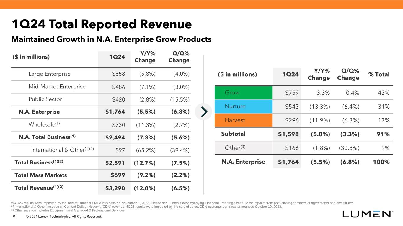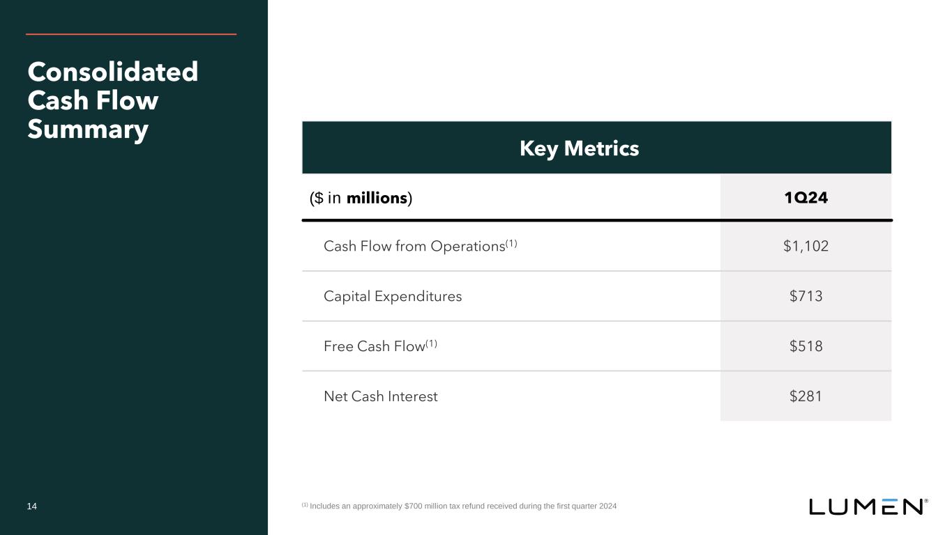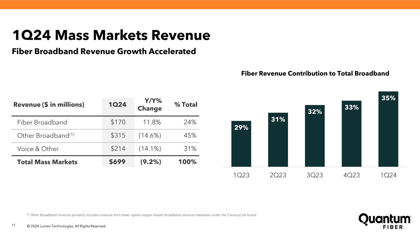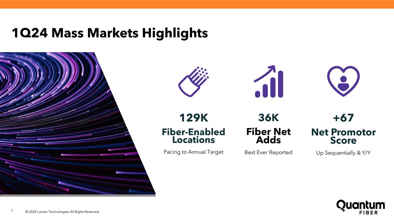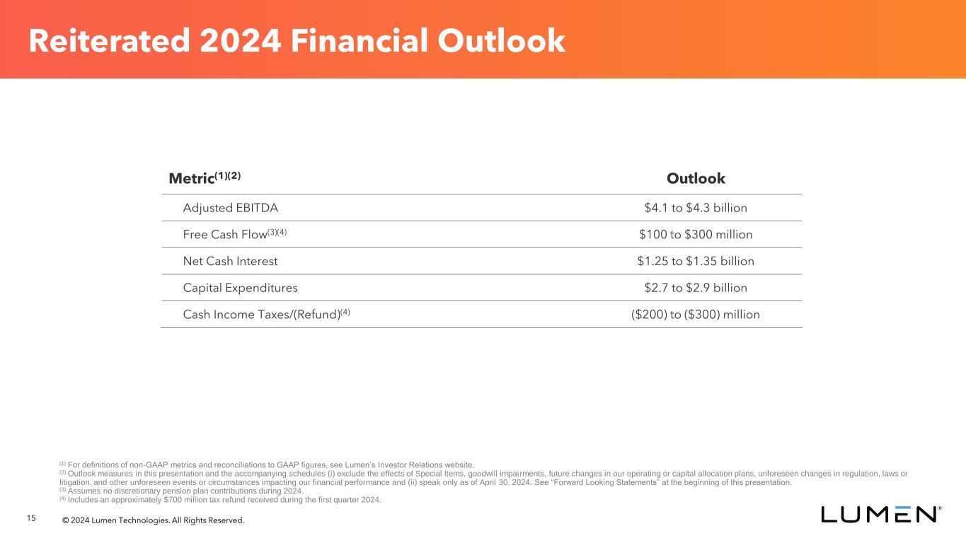 "While we experienced some expected headwinds in the first quarter, we accelerated North America Enterprise sales to fuel future revenue streams, drove material improvement in customer satisfaction scores across customer channels, and delivered our best-ever reported Quantum Fiber broadband net additions. This progress, coupled with executing our debt restructuring and strategically shape shifting to drive cost efficiency, gives us line of sight around our expectations for improving financial results in 2024 and beyond.”