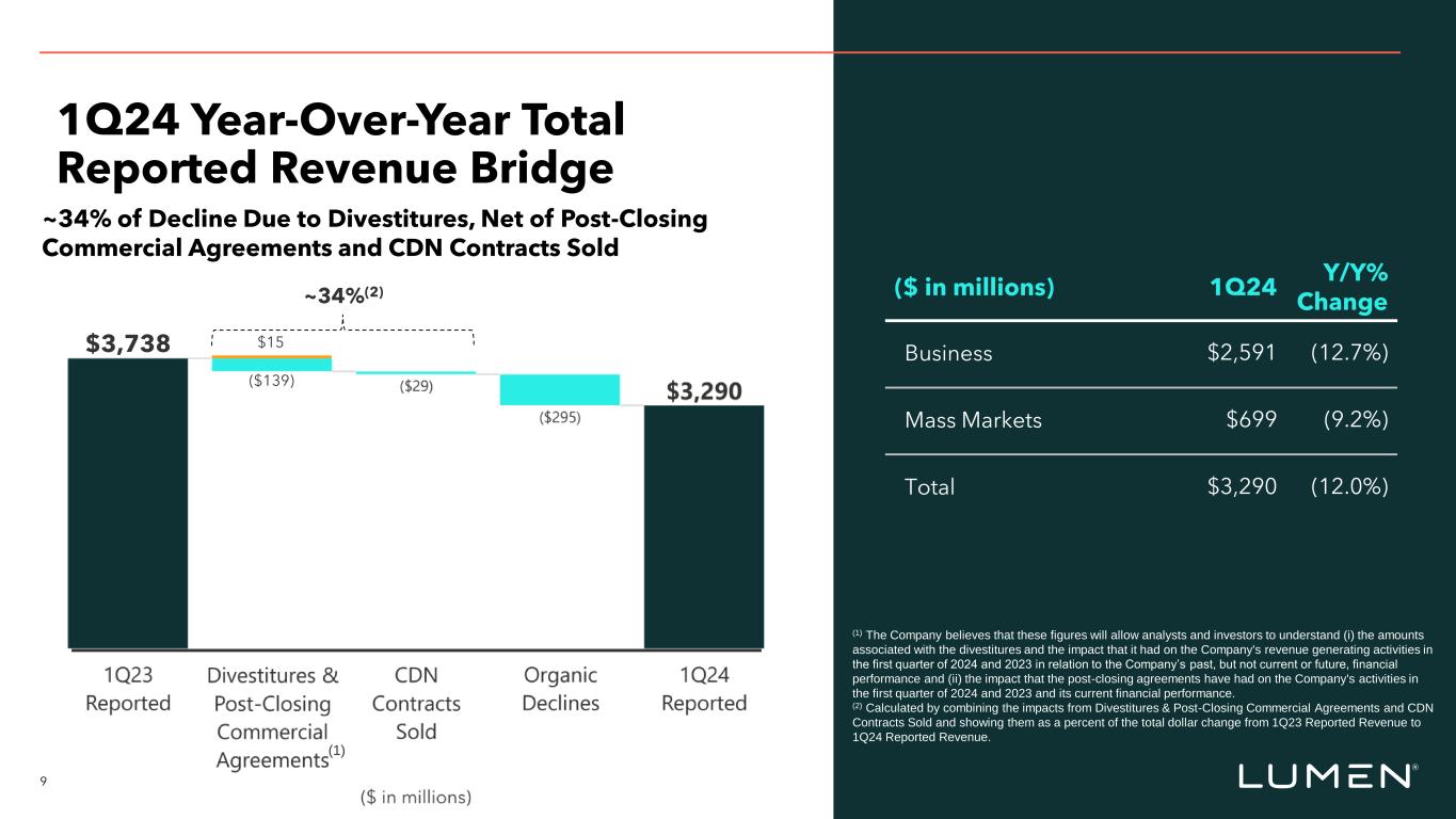 1Q24 Year-Over-Year Total Reported Revenue Bridge ~34% of Decline Due to Divestitures, Net of Post-Closing Commercial Agreements and CDN Contracts Sold (1) The Company believes that these figures will allow analysts and investors to understand (i) the amounts associated with the divestitures and the impact that it had on the Company's revenue generating activities in the first quarter of 2024 and 2023 in relation to the Company’s past, but not current or future, financial performance and (ii) the impact that the post-closing agreements have had on the Company's activities in the first quarter of 2024 and 2023 and its current financial performance. (2) Calculated by combining the impacts from Divestitures & Post-Closing Commercial Agreements and CDN Contracts Sold and showing them as a percent of the total dollar change from 1Q23 Reported Revenue to 1Q24 Reported Revenue. ($ in millions) 1Q24 Y/Y% Change Business $2,591 (12.7%) Mass Markets $699 (9.2%) Total $3,290 (12.0%) $15 (1) ($139) ~34%(2) $3,738 9