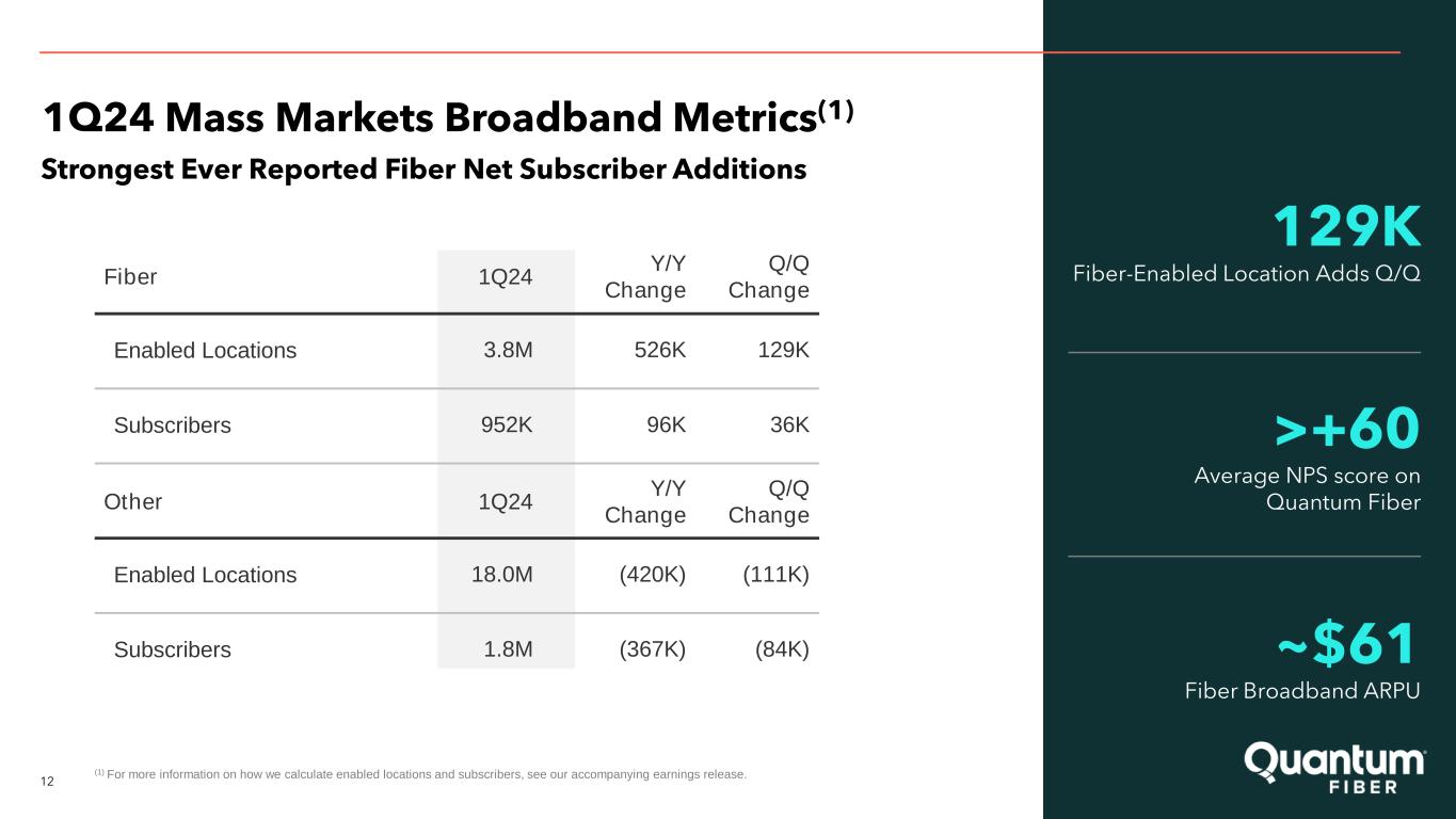 1Q24 Mass Markets Broadband Metrics(1) 129K Fiber-Enabled Location Adds Q/Q >+60 Average NPS score on Quantum Fiber ~$61 Fiber Broadband ARPU (1) For more information on how we calculate enabled locations and subscribers, see our accompanying earnings release. Strongest Ever Reported Fiber Net Subscriber Additions Fiber 1Q24 Y/Y Change Q/Q Change Enabled Locations 3.8M 526K 129K Subscribers 952K 96K 36K Other 1Q24 Y/Y Change Q/Q Change Enabled Locations 18.0M (420K) (111K) Subscribers 1.8M (367K) (84K) 12