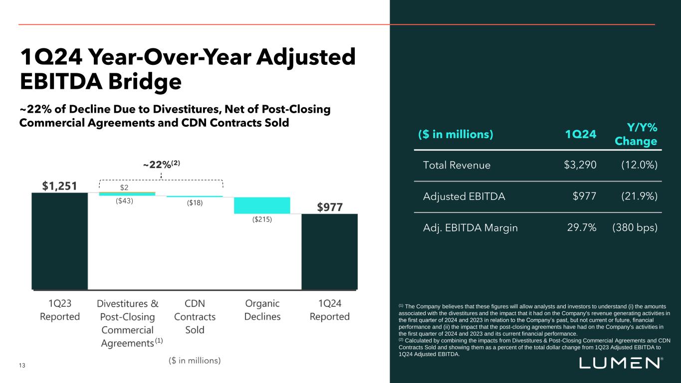 ~22%(2) 1Q24 Year-Over-Year Adjusted EBITDA Bridge ~22% of Decline Due to Divestitures, Net of Post-Closing Commercial Agreements and CDN Contracts Sold $2 (1) ($43) (1) The Company believes that these figures will allow analysts and investors to understand (i) the amounts associated with the divestitures and the impact that it had on the Company's revenue generating activities in the first quarter of 2024 and 2023 in relation to the Company’s past, but not current or future, financial performance and (ii) the impact that the post-closing agreements have had on the Company's activities in the first quarter of 2024 and 2023 and its current financial performance. (2) Calculated by combining the impacts from Divestitures & Post-Closing Commercial Agreements and CDN Contracts Sold and showing them as a percent of the total dollar change from 1Q23 Adjusted EBITDA to 1Q24 Adjusted EBITDA. ($ in millions) 1Q24 Y/Y% Change Total Revenue $3,290 (12.0%) Adjusted EBITDA $977 (21.9%) Adj. EBITDA Margin 29.7% (380 bps) 13