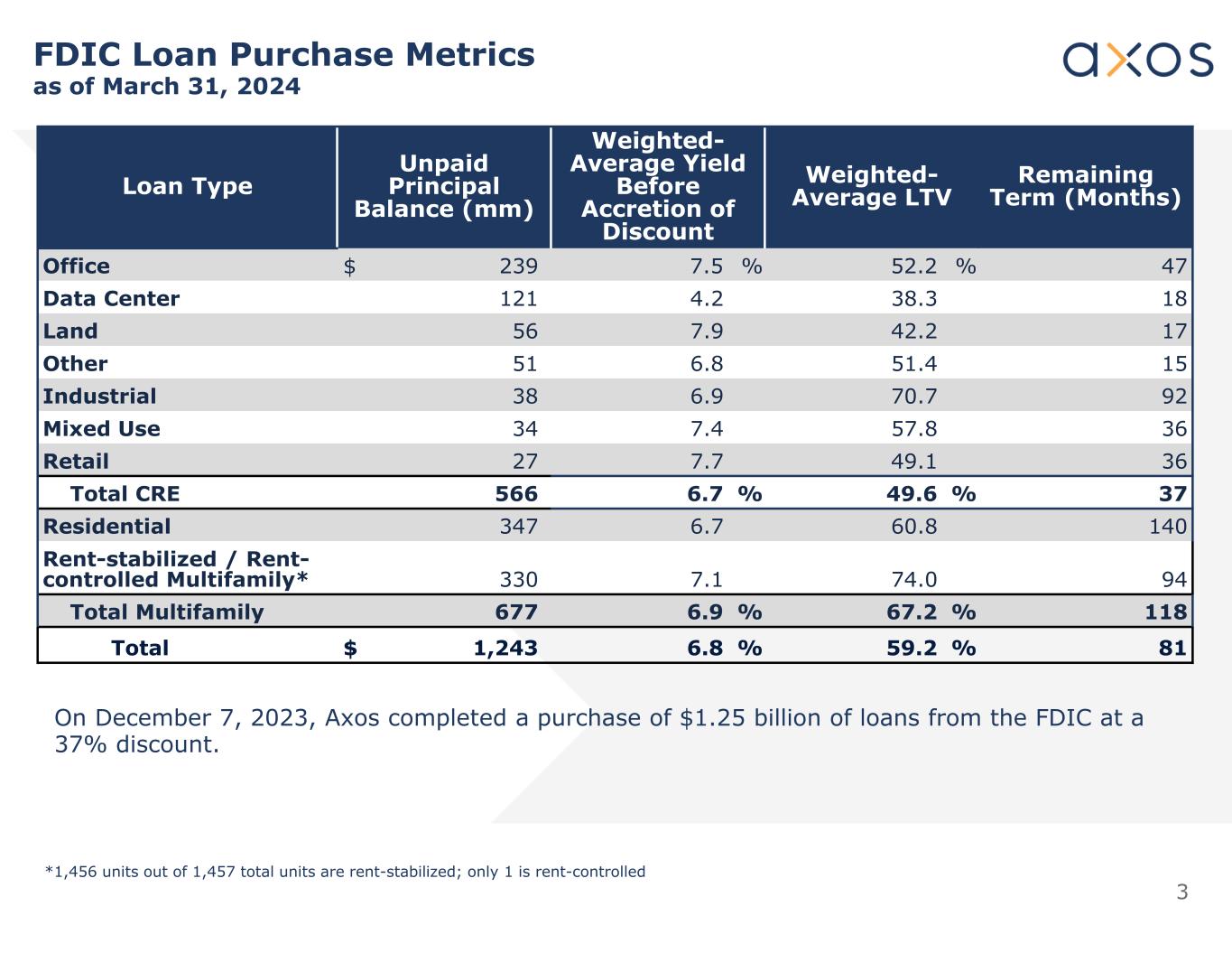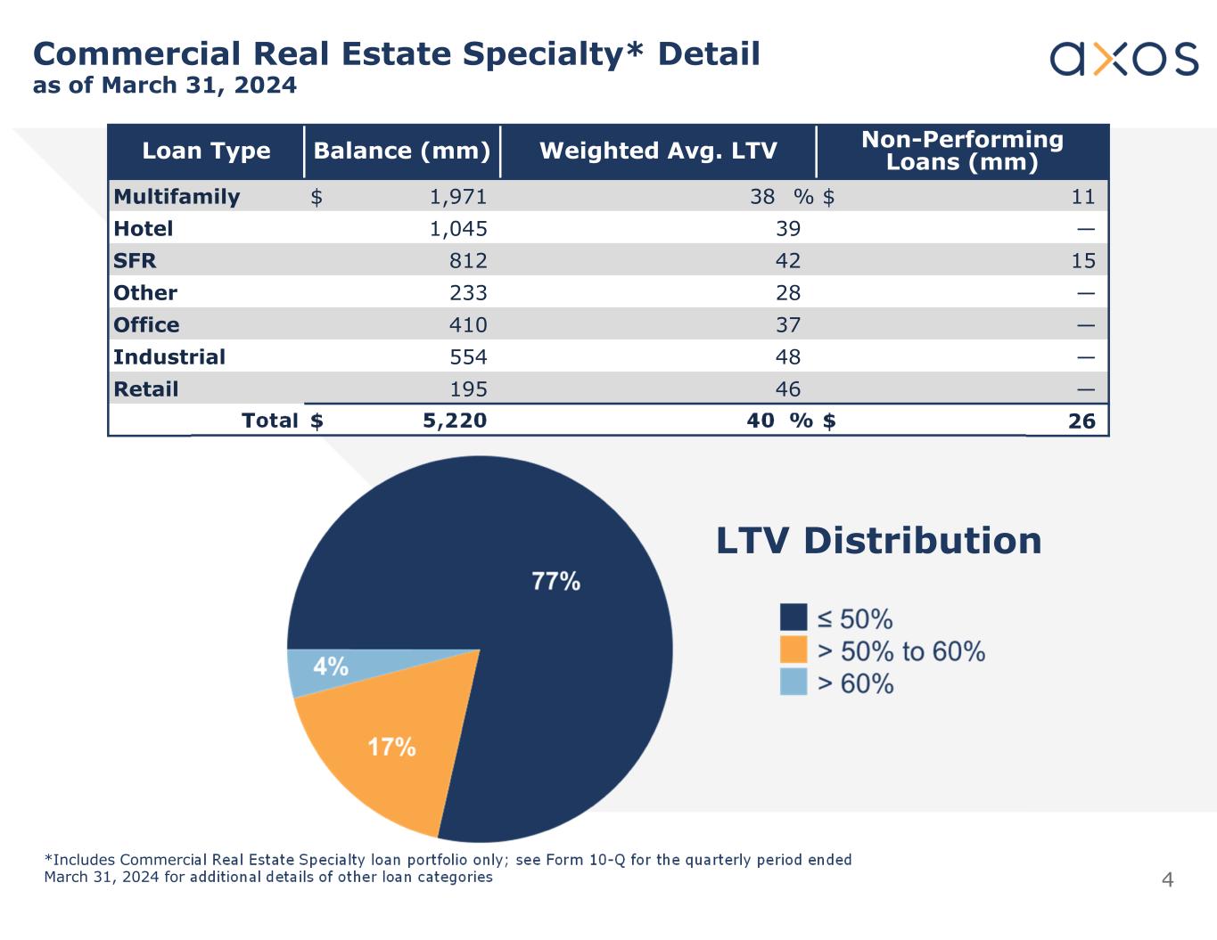 3 FDIC Loan Purchase Metrics as of March 31, 2024 Remaining Term (Months) Weighted- Average LTV Weighted- Average Yield Before Accretion of Discount Unpaid Principal Balance (mm) Loan Type 4752.2 %7.5 %$ 239Office 1838.34.2121Data Center 1742.27.956Land 1551.46.851Other 9270.76.938Industrial 3657.87.434Mixed Use 3649.17.727Retail 3749.6 %6.7 %566Total CRE 14060.86.7347Residential 9474.07.1330 Rent-stabilized / Rent- controlled Multifamily* 11867.2 %6.9 %677Total Multifamily 8159.2 %6.8 %$ 1,243Total *1,456 units out of 1,457 total units are rent-stabilized; only 1 is rent-controlled On December 7, 2023, Axos completed a purchase of $1.25 billion of loans from the FDIC at a 37% discount.