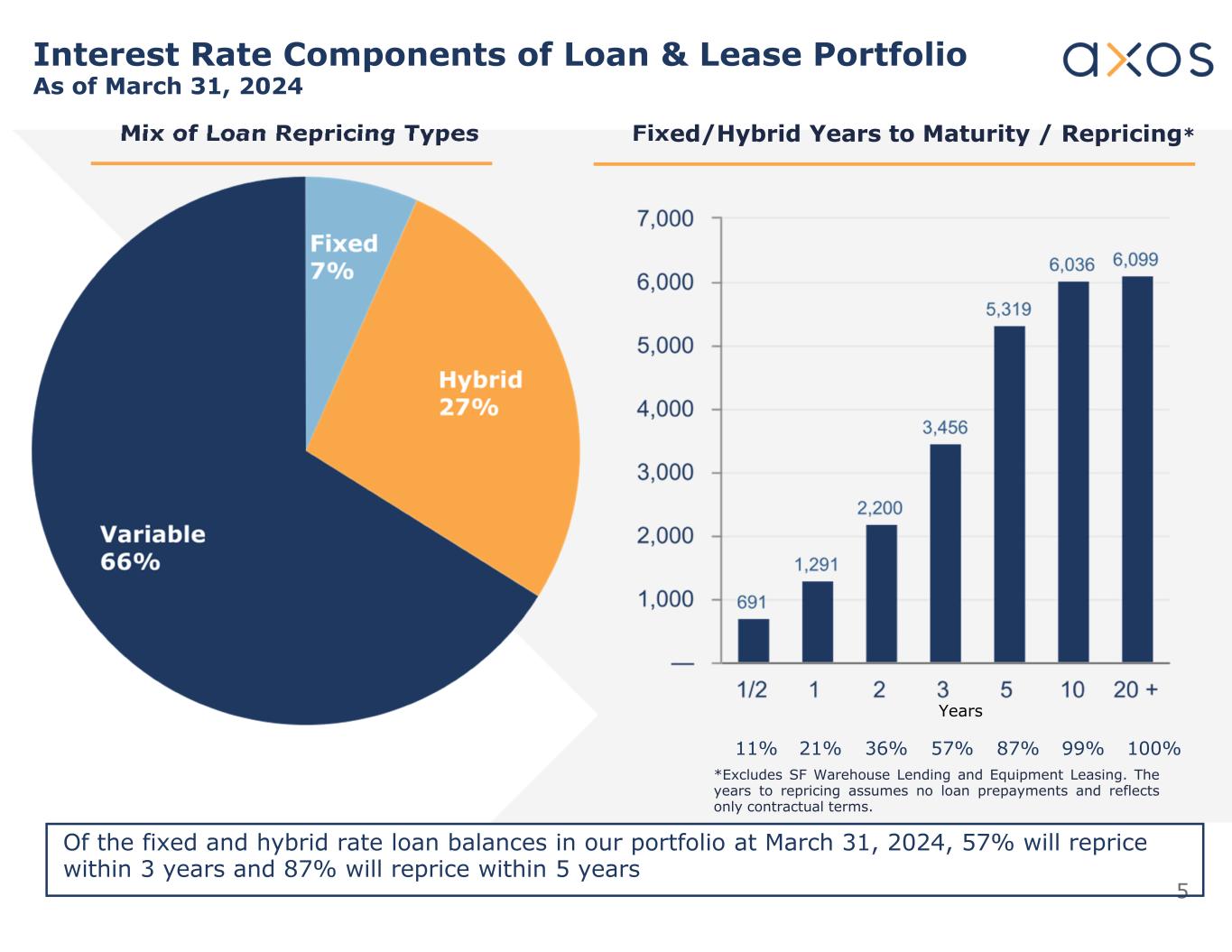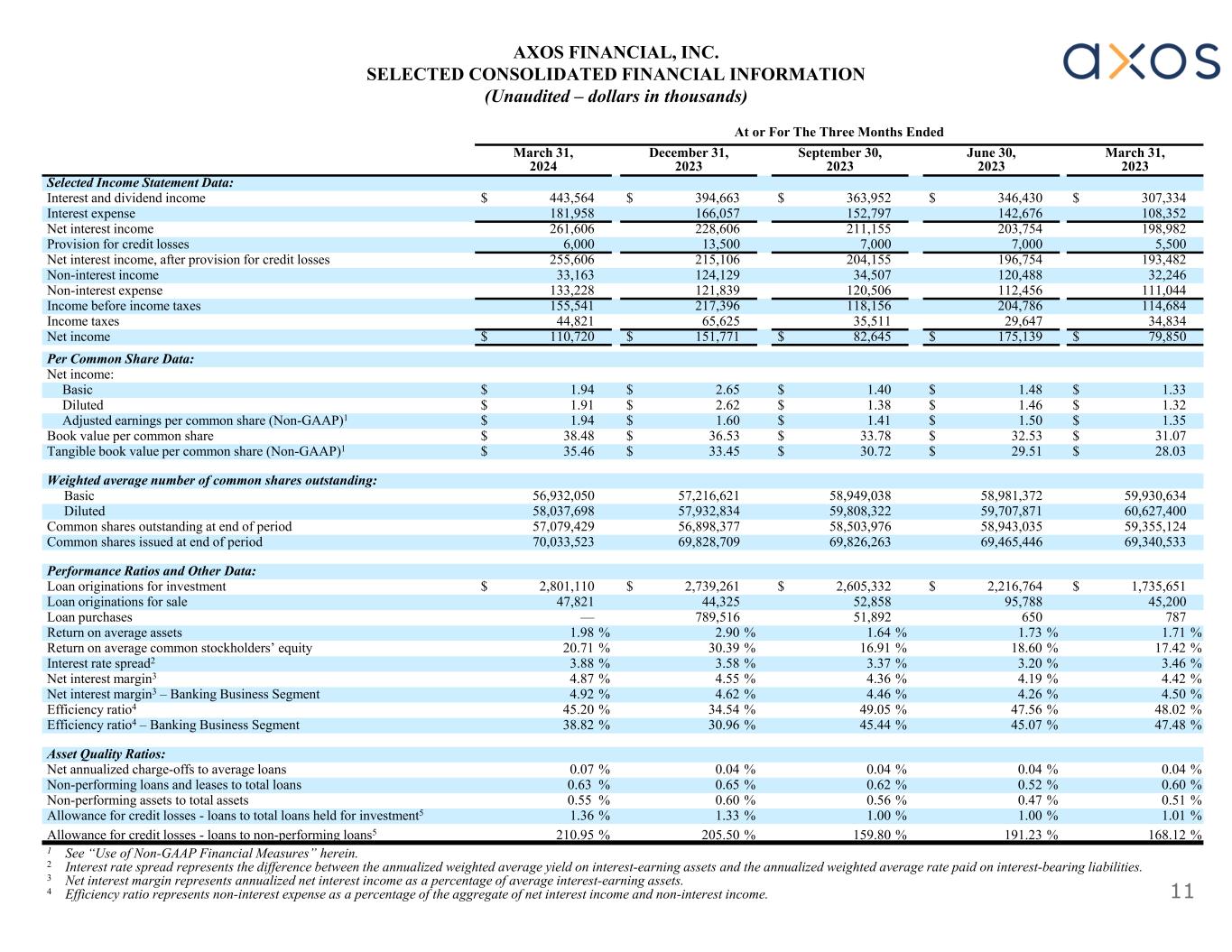 10 March 31, 2023 June 30, 2023 September 30, 2023 December 31, 2023 March 31, 2024 Selected Balance Sheet Data: $ 19,782,481$ 20,348,469$ 20,825,206$ 21,623,764$ 22,642,133Total assets 15,836,25516,456,72816,955,04118,264,35418,733,455Loans—net of allowance for credit losses 7,92023,2038,01413,46816,239Loans held for sale, carried at fair value 303776———Loans held for sale, lower of cost or fair value 161,293166,680170,870251,749257,522Allowance for credit losses 400758640329592Securities—trading 279,612232,350236,726239,812207,582Securities—available-for-sale 87,293134,33996,424145,176105,853Securities borrowed 323,359374,074285,423265,857292,630Customer, broker-dealer and clearing receivables 16,738,86917,123,10817,565,74118,203,91219,103,532Total deposits 90,00090,00090,00090,00090,000Advances from the FHLB 334,330361,779447,733341,086330,389Borrowings, subordinated notes and debentures 114,613159,832116,446155,492119,800Securities loaned 406,092445,477341,915368,885387,176Customer, broker-dealer and clearing payables 1,844,1041,917,1591,976,2082,078,2242,196,293Total stockholders’ equity Capital Ratios: 9.32 %9.42 %9.49 %9.61 %9.70 %Equity to assets at end of period Axos Financial, Inc.: 9.29 %8.96 %9.27 %9.39 %9.33 %Tier 1 leverage (to adjusted average assets) 10.71 %10.94 %11.11 %10.97 %11.47 %Common equity tier 1 capital (to risk-weighted assets) 10.71 %10.94 %11.11 %10.97 %11.47 %Tier 1 capital (to risk-weighted assets) 13.63 %13.82 %14.06 %13.79 %14.26 %Total capital (to risk-weighted assets) Axos Bank: 10.17 %9.68 %9.99 %10.22 %9.86 %Tier 1 leverage (to adjusted average assets) 11.55 %11.63 %11.69 %12.26 %12.47 %Common equity tier 1 capital (to risk-weighted assets) 11.55 %11.63 %11.69 %12.26 %12.47 %Tier 1 capital (to risk-weighted assets) 12.40 %12.50 %12.65 %13.25 %13.49 %Total capital (to risk-weighted assets) Axos Clearing LLC: $ 79,459$ 35,221$ 101,391$ 103,454$ 102,963Net capital $ 74,377$ 29,905$ 96,211$ 98,397$ 97,646Excess capital 31.27 %13.25 %39.14 %40.92 %38.73 %Net capital as a percentage of aggregate debit items $ 66,755$ 21,930$ 88,440$ 90,812$ 89,671Net capital in excess of 5% aggregate debit items AXOS FINANCIAL, INC. SELECTED CONSOLIDATED FINANCIAL INFORMATION (Unaudited – dollars in thousands)