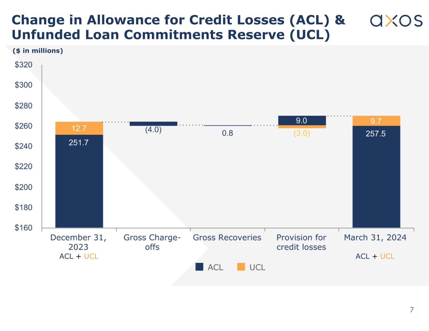 6 Diversified Deposit Gathering Approximately 90% of deposits are FDIC-insured or collateralized *Deposit balances as of March 31, 2024 1Excludes approximately $550 million of off-balance sheet deposits 2Excludes approximately $700 million of client deposits held at other banks › Serves approximately 40% of U.S. Chapter 7 bankruptcy trustees in exclusive relationship › Software allows servicing of SEC receivers and non-chapter 7 cases › Full service digital banking, wealth management, and securities trading › White-label banking › Business banking with simple suite of cash management services › 1031 exchange firms › Title and escrow companies › HOA and property management › Business management and entertainment › Broker-dealer client cash › Broker-dealer reserve accounts › Full service treasury/cash management › Team enhancements and geographic expansion › Bank and securities cross-sell Fiduciary Services $1.2B Consumer Direct $10.9B Specialty Deposits $1.3B2 Distribution Partners $0.5B Axos Securities $0.8B1 Small Business Banking $0.4B Commercial & Treasury Management $4.0B Diversified Deposit Gathering Business Lines