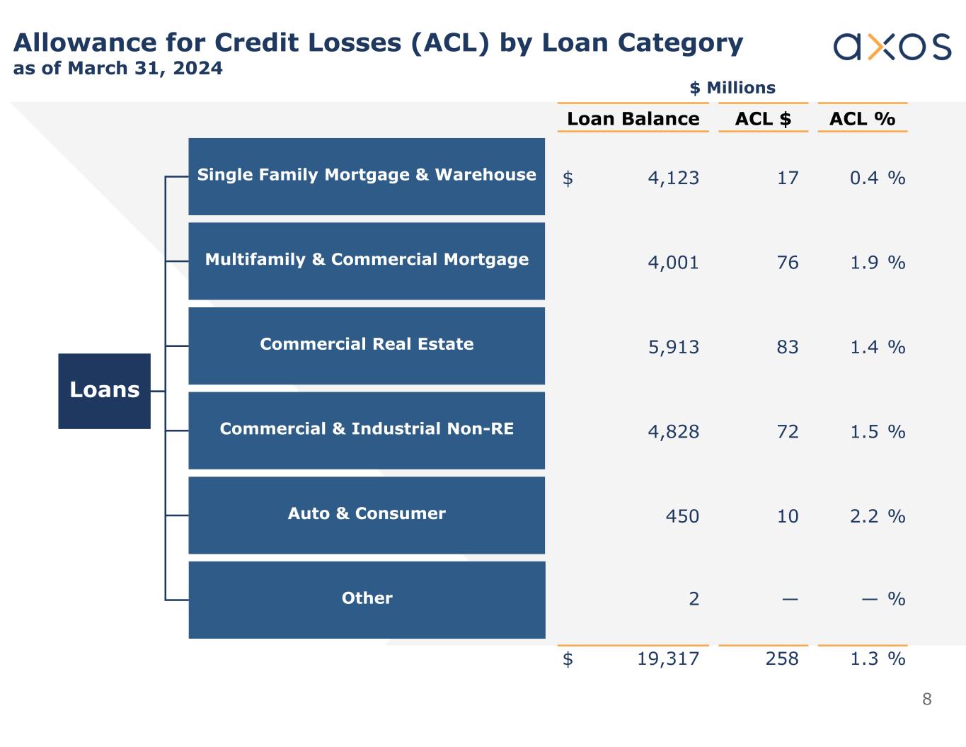 “Our asset-based lending at low loan-to-values credit philosophy continues to serve us well, with non-performing assets remaining relatively stable” stated Derrick Walsh, Executive Vice President and Chief Financial Officer of Axos. “We continue to generate excess capital due to our strong returns and net interest margin, with a return on average common stockholders’ equity of 20.71% and a return on average assets of 1.98% in the three months ended March 31, 2024. Our strong capital position allows us to balance organic growth and opportunistic asset, business and talent acquisition with common share repurchases.”
