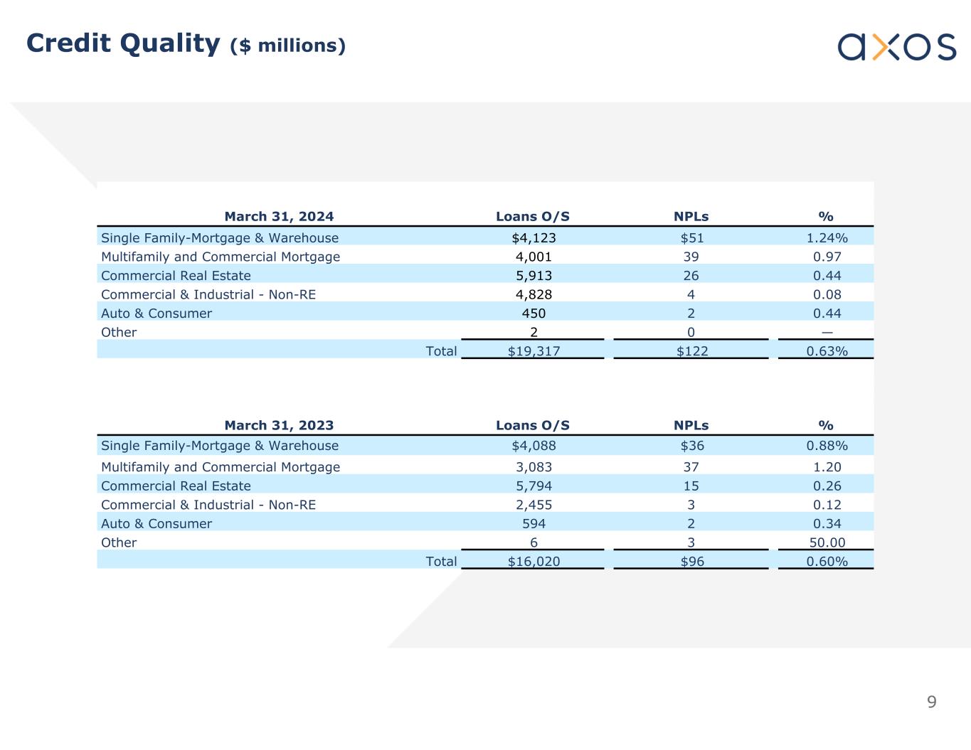 8 Allowance for Credit Losses (ACL) by Loan Category as of March 31, 2024 $ Millions ACL %ACL $Loan Balance 0.4 %17$ 4,123 1.9 %764,001 1.4 %835,913 1.5 %724,828 2.2 %10450 — %—2 1.3 %258$ 19,317 Single Family Mortgage & Warehouse Multifamily & Commercial Mortgage Commercial Real Estate Commercial & Industrial Non-RE Auto & Consumer Other Loans