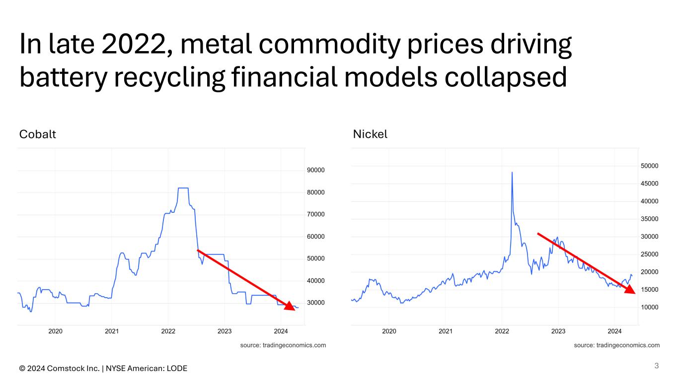 In late 2022, metal commodity prices driving battery recycling financial models collapsed Cobalt Nickel © 2024 Comstock Inc. | NYSE American: LODE 3