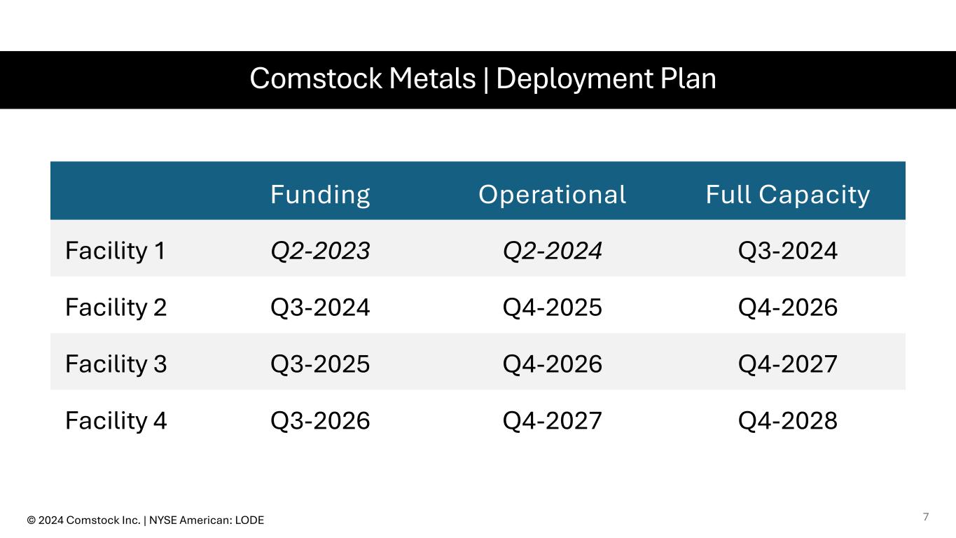 Expansion Model 100,000 ton / year facilities $12 million build cost each project level financing © 2024 Comstock Inc. | NYSE American: LODE 6
