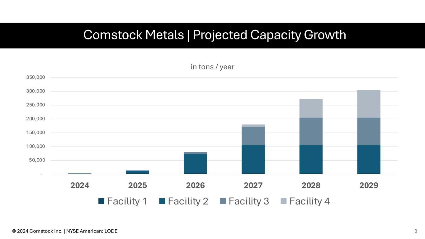 Comstock Metals | Deployment Plan Funding Operational Full Capacity Facility 1 Q2-2023 Q2-2024 Q3-2024 Facility 2 Q3-2024 Q4-2025 Q4-2026 Facility 3 Q3-2025 Q4-2026 Q4-2027 Facility 4 Q3-2026 Q4-2027 Q4-2028 © 2024 Comstock Inc. | NYSE American: LODE 7