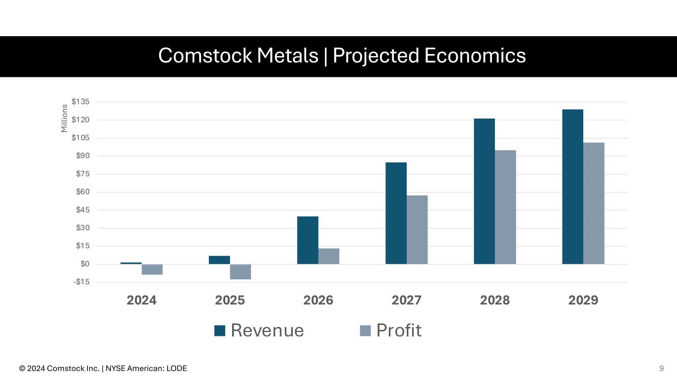 Comstock Metals | Projected Capacity Growth - 50,000 100,000 150,000 200,000 250,000 300,000 350,000 2024 2025 2026 2027 2028 2029 in tons / year Facility 1 Facility 2 Facility 3 Facility 4 © 2024 Comstock Inc. | NYSE American: LODE 8