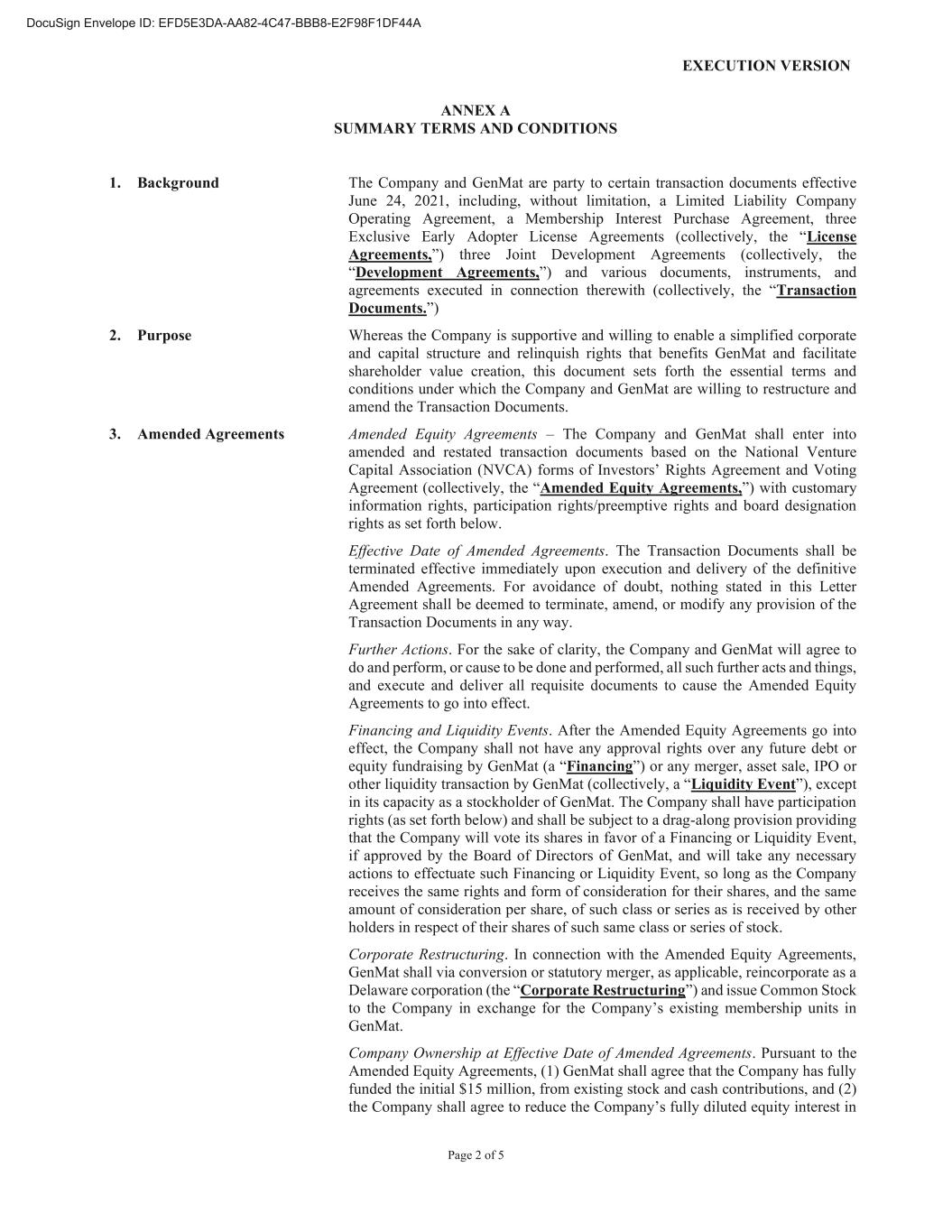 EXECUTION VERSION Page 2 of 5 ANNEX A SUMMARY TERMS AND CONDITIONS 1. Background The Company and GenMat are party to certain transaction documents effective June 24, 2021, including, without limitation, a Limited Liability Company Operating Agreement, a Membership Interest Purchase Agreement, three Exclusive Early Adopter License Agreements (collectively, the “License Agreements,”) three Joint Development Agreements (collectively, the “Development Agreements,”) and various documents, instruments, and agreements executed in connection therewith (collectively, the “Transaction Documents.”) 2. Purpose Whereas the Company is supportive and willing to enable a simplified corporate and capital structure and relinquish rights that benefits GenMat and facilitate shareholder value creation, this document sets forth the essential terms and conditions under which the Company and GenMat are willing to restructure and amend the Transaction Documents. 3. Amended Agreements Amended Equity Agreements – The Company and GenMat shall enter into amended and restated transaction documents based on the National Venture Capital Association (NVCA) forms of Investors’ Rights Agreement and Voting Agreement (collectively, the “Amended Equity Agreements,”) with customary information rights, participation rights/preemptive rights and board designation rights as set forth below. Effective Date of Amended Agreements. The Transaction Documents shall be terminated effective immediately upon execution and delivery of the definitive Amended Agreements. For avoidance of doubt, nothing stated in this Letter Agreement shall be deemed to terminate, amend, or modify any provision of the Transaction Documents in any way. Further Actions. For the sake of clarity, the Company and GenMat will agree to do and perform, or cause to be done and performed, all such further acts and things, and execute and deliver all requisite documents to cause the Amended Equity Agreements to go into effect. Financing and Liquidity Events. After the Amended Equity Agreements go into effect, the Company shall not have any approval rights over any future debt or equity fundraising by GenMat (a “Financing”) or any merger, asset sale, IPO or other liquidity transaction by GenMat (collectively, a “Liquidity Event”), except in its capacity as a stockholder of GenMat. The Company shall have participation rights (as set forth below) and shall be subject to a drag-along provision providing that the Company will vote its shares in favor of a Financing or Liquidity Event, if approved by the Board of Directors of GenMat, and will take any necessary actions to effectuate such Financing or Liquidity Event, so long as the Company receives the same rights and form of consideration for their shares, and the same amount of consideration per share, of such class or series as is received by other holders in respect of their shares of such same class or series of stock. Corporate Restructuring. In connection with the Amended Equity Agreements, GenMat shall via conversion or statutory merger, as applicable, reincorporate as a Delaware corporation (the “Corporate Restructuring”) and issue Common Stock to the Company in exchange for the Company’s existing membership units in GenMat. Company Ownership at Effective Date of Amended Agreements. Pursuant to the Amended Equity Agreements, (1) GenMat shall agree that the Company has fully funded the initial $15 million, from existing stock and cash contributions, and (2) the Company shall agree to reduce the Company’s fully diluted equity interest in