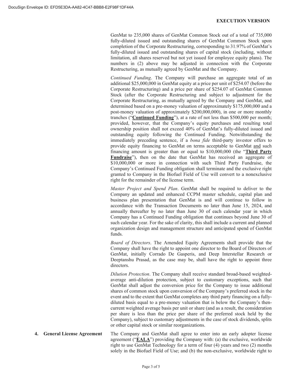 EXECUTION VERSION Page 3 of 5 GenMat to 235,000 shares of GenMat Common Stock out of a total of 735,000 fully-diluted issued and outstanding shares of GenMat Common Stock upon completion of the Corporate Restructuring, corresponding to 31.97% of GenMat’s fully-diluted issued and outstanding shares of capital stock (including, without limitation, all shares reserved but not yet issued for employee equity plans). The numbers in (2) above may be adjusted in connection with the Corporate Restructuring, as mutually agreed by GenMat and the Company. Continued Funding. The Company will purchase an aggregate total of an additional $25,000,000 in GenMat equity at a price per unit of $254.07 (before the Corporate Restructuring) and a price per share of $254.07 of GenMat Common Stock (after the Corporate Restructuring and subject to adjustment for the Corporate Restructuring, as mutually agreed by the Company and GenMat, and determined based on a pre-money valuation of approximately $175,000,000 and a post-money valuation of approximately $200,000,000), in one or more monthly tranches (“Continued Funding”), at a rate of not less than $500,000 per month; provided, however, that the Company’s equity purchases and resulting total ownership position shall not exceed 40% of GenMat’s fully-diluted issued and outstanding equity following the Continued Funding. Notwithstanding the immediately preceding sentence, if a bona fide third-party investor offers to provide equity financing to GenMat on terms acceptable to GenMat and such financing amount is greater than or equal to $10,000,000 (the “Third Party Fundraise”), then on the date that GenMat has received an aggregate of $10,000,000 or more in connection with such Third Party Fundraise, the Company’s Continued Funding obligation shall terminate and the exclusive right granted to Company in the Biofuel Field of Use will convert to a nonexclusive right for the remainder of the license term. Master Project and Spend Plan. GenMat shall be required to deliver to the Company an updated and enhanced CCPM master schedule, capital plan and business plan presentation that GenMat is and will continue to follow in accordance with the Transaction Documents no later than June 15, 2024, and annually thereafter by no later than June 30 of each calendar year in which Company has a Continued Funding obligation that continues beyond June 30 of such calendar year. For the sake of clarity, this shall include a current and planned organization design and management structure and anticipated spend of GenMat funds. Board of Directors. The Amended Equity Agreements shall provide that the Company shall have the right to appoint one director to the Board of Directors of GenMat, initially Corrado De Gasperis, and Deep Interstellar Research or Deeptanshu Prasad, as the case may be, shall have the right to appoint three directors. Dilution Protection. The Company shall receive standard broad-based weighted- average anti-dilution protection, subject to customary exceptions, such that GenMat shall adjust the conversion price for the Company to issue additional shares of common stock upon conversion of the Company’s preferred stock in the event and to the extent that GenMat completes any third party financing on a fully- diluted basis equal to a pre-money valuation that is below the Company’s then- current weighted average basis per unit or share (and as a result, the consideration per share is less than the price per share of the preferred stock held by the Company), subject to customary adjustments in the case of stock dividends, splits or other capital stock or similar reorganizations. 4. General License Agreement The Company and GenMat shall agree to enter into an early adopter license agreement (“EALA”) providing the Company with: (a) the exclusive, worldwide right to use GenMat Technology for a term of four (4) years and two (2) months solely in the Biofuel Field of Use; and (b) the non-exclusive, worldwide right to