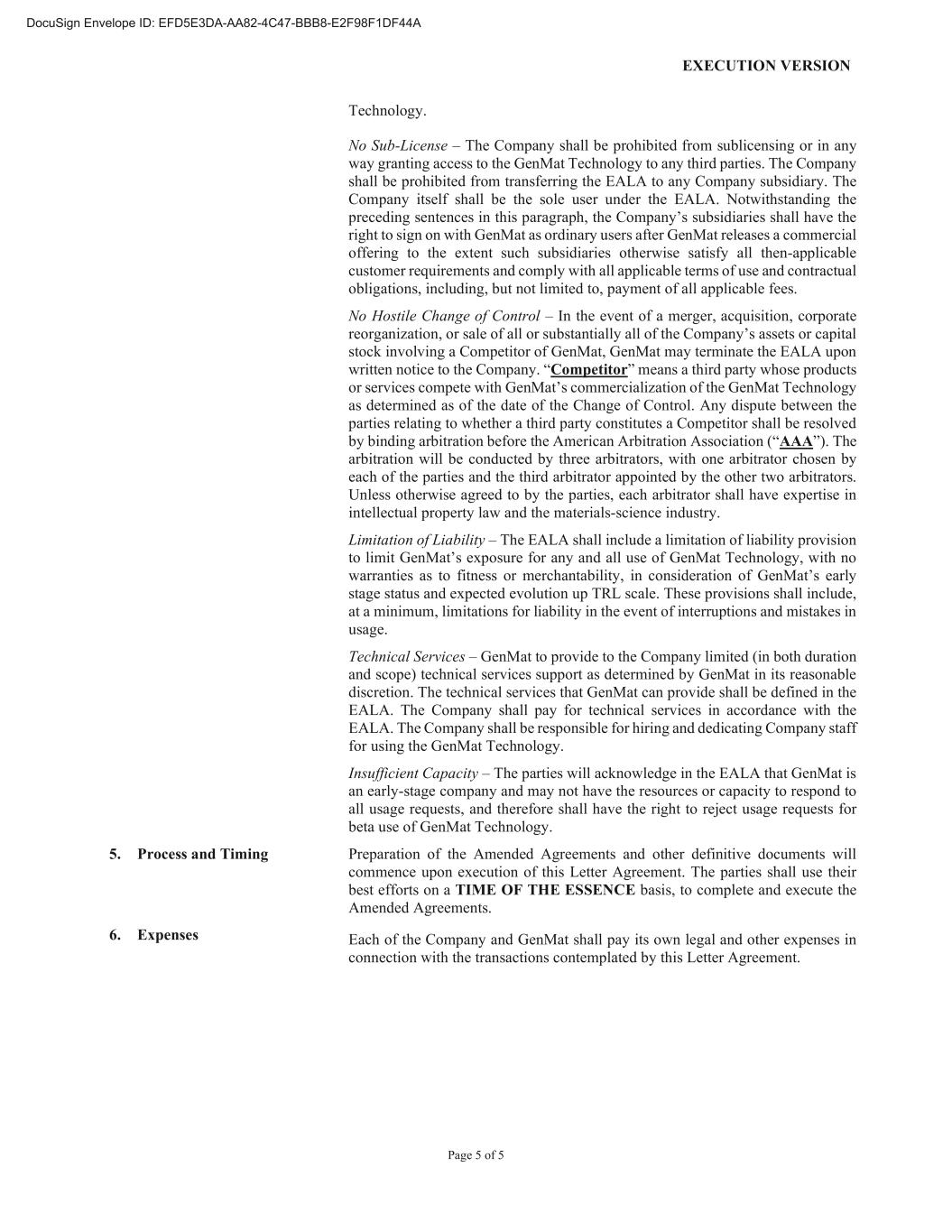 EXECUTION VERSION Page 5 of 5 Technology. No Sub-License – The Company shall be prohibited from sublicensing or in any way granting access to the GenMat Technology to any third parties. The Company shall be prohibited from transferring the EALA to any Company subsidiary. The Company itself shall be the sole user under the EALA. Notwithstanding the preceding sentences in this paragraph, the Company’s subsidiaries shall have the right to sign on with GenMat as ordinary users after GenMat releases a commercial offering to the extent such subsidiaries otherwise satisfy all then-applicable customer requirements and comply with all applicable terms of use and contractual obligations, including, but not limited to, payment of all applicable fees. No Hostile Change of Control – In the event of a merger, acquisition, corporate reorganization, or sale of all or substantially all of the Company’s assets or capital stock involving a Competitor of GenMat, GenMat may terminate the EALA upon written notice to the Company. “Competitor” means a third party whose products or services compete with GenMat’s commercialization of the GenMat Technology as determined as of the date of the Change of Control. Any dispute between the parties relating to whether a third party constitutes a Competitor shall be resolved by binding arbitration before the American Arbitration Association (“AAA”). The arbitration will be conducted by three arbitrators, with one arbitrator chosen by each of the parties and the third arbitrator appointed by the other two arbitrators. Unless otherwise agreed to by the parties, each arbitrator shall have expertise in intellectual property law and the materials-science industry. Limitation of Liability – The EALA shall include a limitation of liability provision to limit GenMat’s exposure for any and all use of GenMat Technology, with no warranties as to fitness or merchantability, in consideration of GenMat’s early stage status and expected evolution up TRL scale. These provisions shall include, at a minimum, limitations for liability in the event of interruptions and mistakes in usage. Technical Services – GenMat to provide to the Company limited (in both duration and scope) technical services support as determined by GenMat in its reasonable discretion. The technical services that GenMat can provide shall be defined in the EALA. The Company shall pay for technical services in accordance with the EALA. The Company shall be responsible for hiring and dedicating Company staff for using the GenMat Technology. Insufficient Capacity – The parties will acknowledge in the EALA that GenMat is an early-stage company and may not have the resources or capacity to respond to all usage requests, and therefore shall have the right to reject usage requests for beta use of GenMat Technology. 5. Process and Timing Preparation of the Amended Agreements and other definitive documents will commence upon execution of this Letter Agreement. The parties shall use their best efforts on a TIME OF THE ESSENCE basis, to complete and execute the Amended Agreements. 6. Expenses Each of the Company and GenMat shall pay its own legal and other expenses in connection with the transactions contemplated by this Letter Agreement.