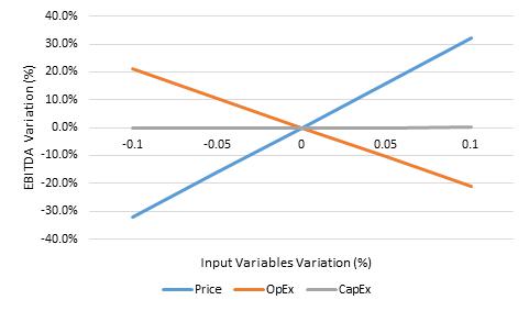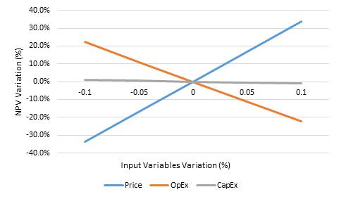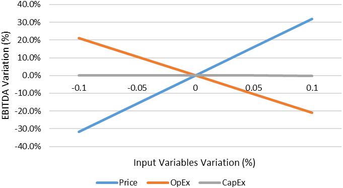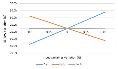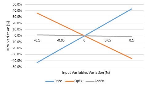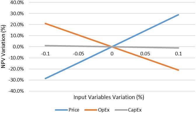 Tables 47 and 48 detail the sensitivity of the NPV and EBITDA to each variable, respectively, when the variables are varied independently. Figures 16 and 17 show the results of the sensitivity of NPV and EBITDA, respectively, to the three variables: