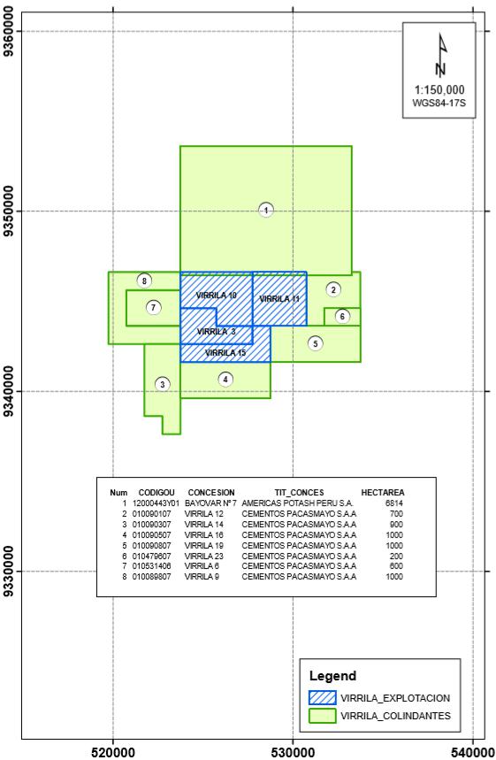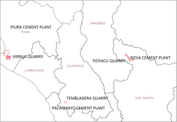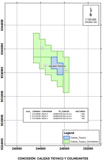 To the north of the Cementos Selva S.A.C. concession is the Rioja 2 concession owned by Cementos Selva S.A.C.; to the east of the mining concession is the Rioja 4 concession owned by Cementos Selva S.A.C., and to the southwest is the Rioja 3 concession owned by Cementos Selva S.A.C.