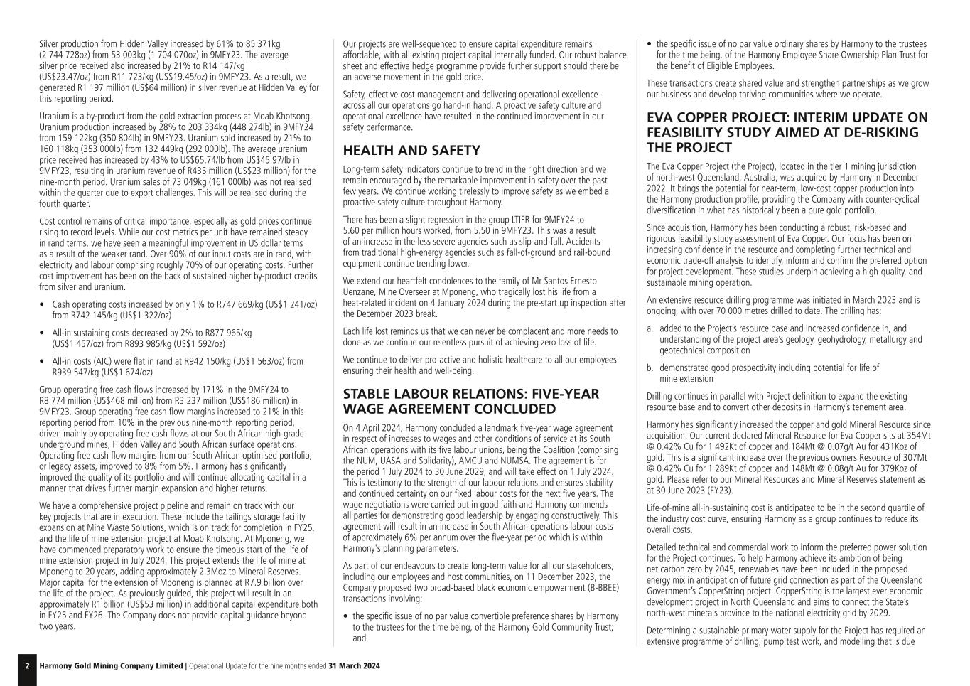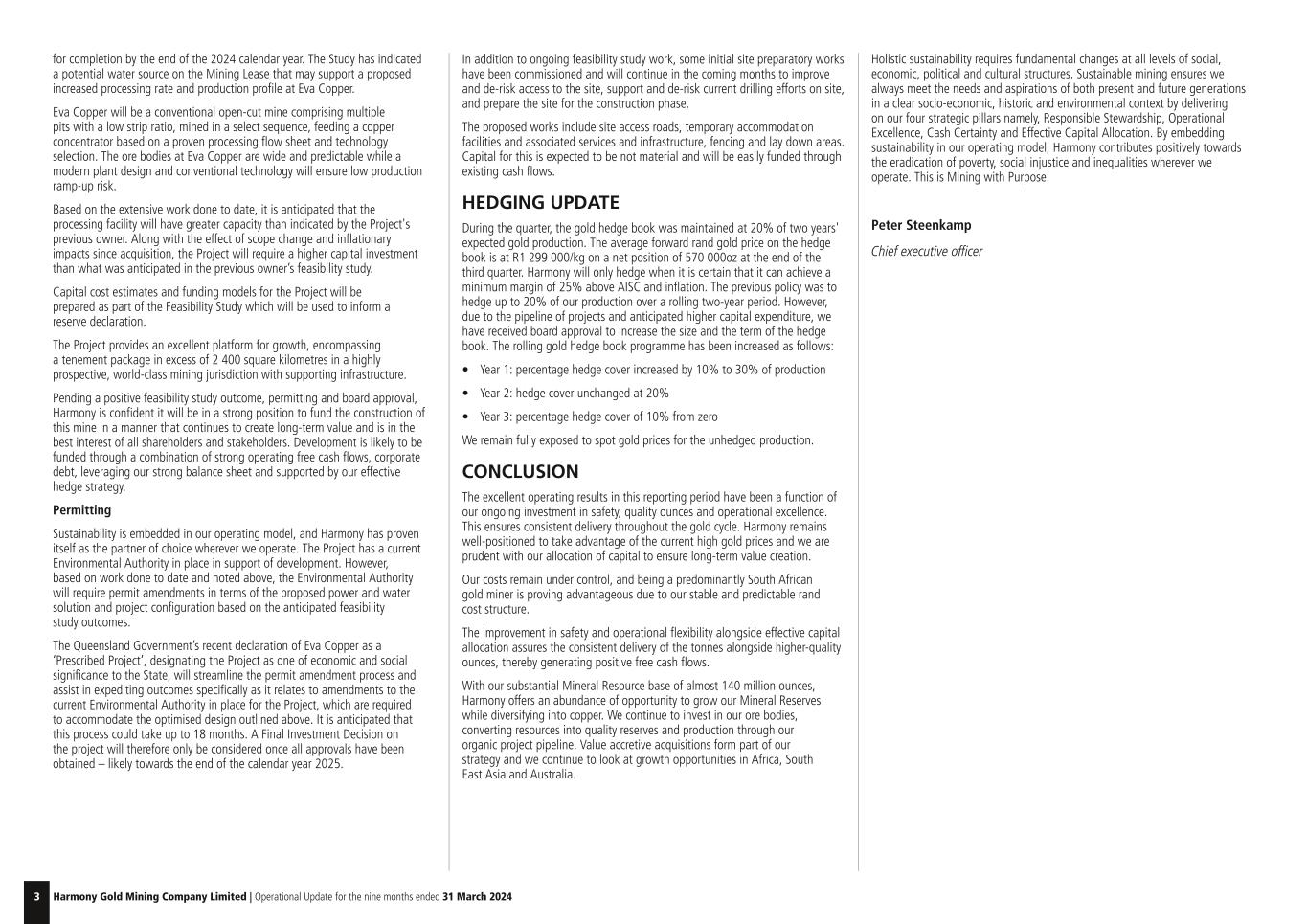 3 Harmony Gold Mining Company Limited | Operational Update for the nine months ended 31 March 2024 for completion by the end of the 2024 calendar year. The Study has indicated a potential water source on the Mining Lease that may support a proposed increased processing rate and production profile at Eva Copper. Eva Copper will be a conventional open-cut mine comprising multiple pits with a low strip ratio, mined in a select sequence, feeding a copper concentrator based on a proven processing flow sheet and technology selection. The ore bodies at Eva Copper are wide and predictable while a modern plant design and conventional technology will ensure low production ramp-up risk. Based on the extensive work done to date, it is anticipated that the processing facility will have greater capacity than indicated by the Project's previous owner. Along with the effect of scope change and inflationary impacts since acquisition, the Project will require a higher capital investment than what was anticipated in the previous owner’s feasibility study. Capital cost estimates and funding models for the Project will be prepared as part of the Feasibility Study which will be used to inform a reserve declaration. The Project provides an excellent platform for growth, encompassing a tenement package in excess of 2 400 square kilometres in a highly prospective, world-class mining jurisdiction with supporting infrastructure. Pending a positive feasibility study outcome, permitting and board approval, Harmony is confident it will be in a strong position to fund the construction of this mine in a manner that continues to create long-term value and is in the best interest of all shareholders and stakeholders. Development is likely to be funded through a combination of strong operating free cash flows, corporate debt, leveraging our strong balance sheet and supported by our effective hedge strategy. Permitting Sustainability is embedded in our operating model, and Harmony has proven itself as the partner of choice wherever we operate. The Project has a current Environmental Authority in place in support of development. However, based on work done to date and noted above, the Environmental Authority will require permit amendments in terms of the proposed power and water solution and project configuration based on the anticipated feasibility study outcomes. The Queensland Government’s recent declaration of Eva Copper as a ‘Prescribed Project’, designating the Project as one of economic and social significance to the State, will streamline the permit amendment process and assist in expediting outcomes specifically as it relates to amendments to the current Environmental Authority in place for the Project, which are required to accommodate the optimised design outlined above. It is anticipated that this process could take up to 18 months. A Final Investment Decision on the project will therefore only be considered once all approvals have been obtained – likely towards the end of the calendar year 2025. In addition to ongoing feasibility study work, some initial site preparatory works have been commissioned and will continue in the coming months to improve and de-risk access to the site, support and de-risk current drilling efforts on site, and prepare the site for the construction phase. The proposed works include site access roads, temporary accommodation facilities and associated services and infrastructure, fencing and lay down areas. Capital for this is expected to be not material and will be easily funded through existing cash flows. HEDGING UPDATE During the quarter, the gold hedge book was maintained at 20% of two years' expected gold production. The average forward rand gold price on the hedge book is at R1 299 000/kg on a net position of 570 000oz at the end of the third quarter. Harmony will only hedge when it is certain that it can achieve a minimum margin of 25% above AISC and inflation. The previous policy was to hedge up to 20% of our production over a rolling two-year period. However, due to the pipeline of projects and anticipated higher capital expenditure, we have received board approval to increase the size and the term of the hedge book. The rolling gold hedge book programme has been increased as follows: • Year 1: percentage hedge cover increased by 10% to 30% of production • Year 2: hedge cover unchanged at 20% • Year 3: percentage hedge cover of 10% from zero We remain fully exposed to spot gold prices for the unhedged production. CONCLUSION The excellent operating results in this reporting period have been a function of our ongoing investment in safety, quality ounces and operational excellence. This ensures consistent delivery throughout the gold cycle. Harmony remains well-positioned to take advantage of the current high gold prices and we are prudent with our allocation of capital to ensure long-term value creation. Our costs remain under control, and being a predominantly South African gold miner is proving advantageous due to our stable and predictable rand cost structure. The improvement in safety and operational flexibility alongside effective capital allocation assures the consistent delivery of the tonnes alongside higher-quality ounces, thereby generating positive free cash flows. With our substantial Mineral Resource base of almost 140 million ounces, Harmony offers an abundance of opportunity to grow our Mineral Reserves while diversifying into copper. We continue to invest in our ore bodies, converting resources into quality reserves and production through our organic project pipeline. Value accretive acquisitions form part of our strategy and we continue to look at growth opportunities in Africa, South East Asia and Australia. Holistic sustainability requires fundamental changes at all levels of social, economic, political and cultural structures. Sustainable mining ensures we always meet the needs and aspirations of both present and future generations in a clear s