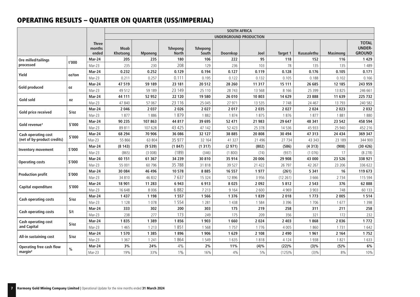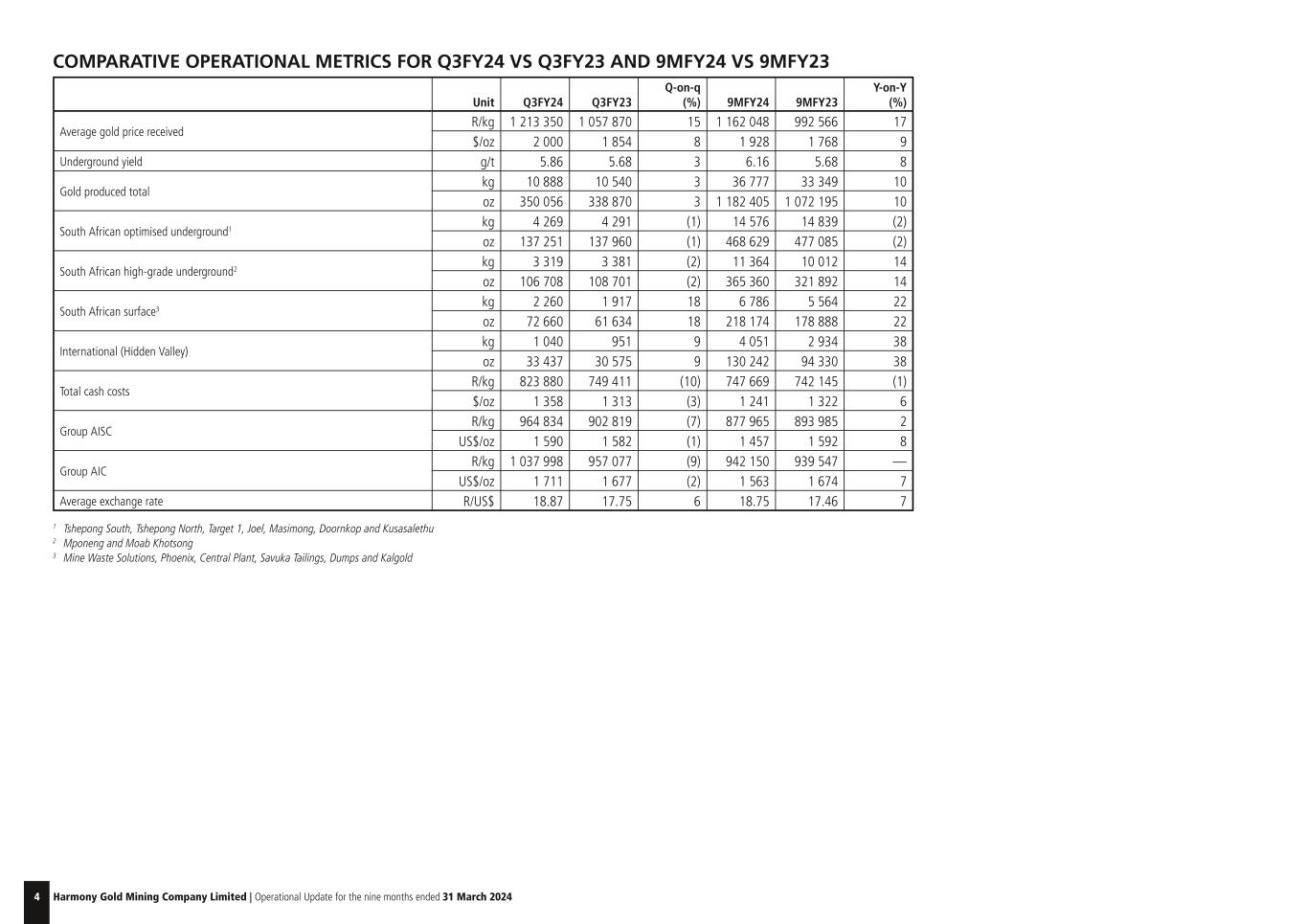 7 Harmony Gold Mining Company Limited | Operational Update for the nine months ended 31 March 2024 Three months ended SOUTH AFRICA UNDERGROUND PRODUCTION Moab Khotsong Mponeng Tshepong North Tshepong South Doornkop Joel Target 1 Kusasalethu Masimong TOTAL UNDER- GROUND Ore milled/tailings processed t'000 Mar-24 205 235 180 106 222 95 118 152 116 1 429 Mar-23 235 230 208 129 236 103 78 135 135 1 489 Yield oz/ton Mar-24 0.232 0.252 0.129 0.194 0.127 0.119 0.128 0.176 0.105 0.171 Mar-23 0.211 0.257 0.111 0.195 0.122 0.132 0.105 0.188 0.102 0.166 Gold produced oz Mar-24 47 519 59 189 23 181 20 512 28 260 11 317 15 111 26 685 12 185 243 959 Mar-23 49 512 59 189 23 149 25 110 28 743 13 568 8 166 25 399 13 825 246 661 Gold sold oz Mar-24 44 111 52 952 22 120 19 580 26 010 10 803 14 629 23 888 11 639 225 732 Mar-23 47 840 57 067 23 116 25 045 27 971 13 535 7 748 24 467 13 793 240 582 Gold price received $/oz Mar-24 2 046 2 037 2 026 2 027 2 017 2 035 2 027 2 024 2 023 2 032 Mar-23 1 877 1 886 1 879 1 882 1 874 1 875 1 876 1 877 1 881 1 880 Gold revenue¹ $'000 Mar-24 90 235 107 863 44 817 39 695 52 471 21 983 29 647 48 341 23 542 458 594 Mar-23 89 811 107 628 43 425 47 142 52 423 25 378 14 536 45 933 25 940 452 216 Cash operating cost (net of by-product credits) $'000 Mar-24 68 294 70 906 36 086 32 127 38 885 20 808 30 494 47 313 24 434 369 347 Mar-23 55 866 63 804 35 977 32 164 41 327 21 496 27 734 43 343 23 189 344 900 Inventory movement $'000 Mar-24 (8 143) (9 539) (1 847) (1 317) (2 971) (802) (586) (4 313) (908) (30 426) Mar-23 (865) (3 008) (189) (346) (1 800) (74) (937) (1 076) 17 (8 278) Operating costs $'000 Mar-24 60 151 61 367 34 239 30 810 35 914 20 006 29 908 43 000 23 526 338 921 Mar-23 55 001 60 796 35 788 31 818 39 527 21 422 26 797 42 267 23 206 336 622 Production profit $'000 Mar-24 30 084 46 496 10 578 8 885 16 557 1 977 (261) 5 341 16 119 673 Mar-23 34 810 46 832 7 637 15 324 12 896 3 956 (12 261) 3 666 2 734 115 594 Capital expenditure $'000 Mar-24 18 901 11 283 6 943 6 913 8 025 2 092 5 812 2 543 376 62 888 Mar-23 16 648 8 006 6 882 7 213 9 164 2 600 4 969 3 903 748 60 133 Cash operating costs $/oz Mar-24 1 437 1 198 1 557 1 566 1 376 1 839 2 018 1 773 2 005 1 514 Mar-23 1 128 1 078 1 554 1 281 1 438 1 584 3 396 1 706 1 677 1 398 Cash operating costs $/t Mar-24 333 302 200 303 175 219 258 311 211 258 Mar-23 238 277 173 249 175 209 356 321 172 232 Cash operating cost and Capital $/oz Mar-24 1 835 1 389 1 856 1 903 1 660 2 024 2 403 1 868 2 036 1 772 Mar-23 1 465 1 213 1 851 1 568 1 757 1 776 4 005 1 860 1 731 1 642 All-in sustaining cost $/oz Mar-24 1 570 1 385 1 896 1 906 1 629 2 108 2 490 1 961 2 164 1 752 Mar-23 1 367 1 241 1 864 1 549 1 635 1 818 4 124 1 938 1 821 1 633 Operating free cash flow margin² % Mar-24 3% 24% 4% 2% 11% (4)% (22)% (3)% (5)% 6% Mar-23 19% 33% 1% 16% 4% 5% (125)% (3)% 8% 10% OPERATING RESULTS – QUARTER ON QUARTER (US$/IMPERIAL)