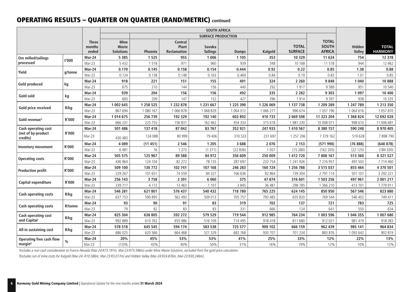 5 Harmony Gold Mining Company Limited | Operational Update for the nine months ended 31 March 2024 Three months ended SOUTH AFRICA UNDERGROUND PRODUCTION Moab Khotsong Mponeng Tshepong North Tshepong South Doornkop Joel Target 1 Kusasalethu Masimong TOTAL UNDER- GROUND Ore milled/tailings processed t'000 Mar-24 186 213 163 96 201 86 107 138 105 1 295 Mar-23 213 209 189 117 214 93 71 122 122 1 350 Yield g/tonne Mar-24 7.95 8.64 4.42 6.65 4.37 4.09 4.39 6.01 3.61 5.86 Mar-23 7.23 8.81 3.81 6.68 4.18 4.54 3.58 6.48 3.52 5.68 Gold produced kg Mar-24 1 478 1 841 721 638 879 352 470 830 379 7 588 Mar-23 1 540 1 841 720 781 894 422 254 790 430 7 672 Gold sold kg Mar-24 1 372 1 647 688 609 809 336 455 743 362 7 021 Mar-23 1 488 1 775 719 779 870 421 241 761 429 7 483 Gold price received R/kg Mar-24 1 241 065 1 235 812 1 229 208 1 229 966 1 223 902 1 234 554 1 229 549 1 227 721 1 227 182 1 232 545 Mar-23 1 071 331 1 076 278 1 072 042 1 074 167 1 069 554 1 069 964 1 070 602 1 071 378 1 073 268 1 072 677 Gold revenue¹ R'000 Mar-24 1 702 741 2 035 382 845 695 749 049 990 137 414 810 559 445 912 197 444 240 8 653 696 Mar-23 1 594 140 1 910 394 770 798 836 776 930 512 450 455 258 015 815 319 460 432 8 026 841 Cash operating cost (net of by-product credits) R'000 Mar-24 1 288 712 1 337 990 680 937 606 239 733 755 392 645 575 423 892 802 461 087 6 969 590 Mar-23 991 628 1 132 512 638 589 570 908 733 545 381 549 492 279 769 345 411 601 6 121 956 Inventory movement R'000 Mar-24 (153 664) (179 998) (34 853) (24 846) (56 065) (15 134) (11 061) (81 392) (17 130) (574 143) Mar-23 (15 349) (53 397) (3 348) (6 140) (31 954) (1 313) (16 626) (19 101) 303 (146 925) Operating costs R'000 Mar-24 1 135 048 1 157 992 646 084 581 393 677 690 377 511 564 362 811 410 443 957 6 395 447 Mar-23 976 279 1 079 115 635 241 564 768 701 591 380 236 475 653 750 244 411 904 5 975 031 Production profit R'000 Mar-24 567 693 877 390 199 611 167 656 312 447 37 299 (4 917) 100 787 283 2 258 249 Mar-23 617 861 831 279 135 557 272 008 228 921 70 219 (217 638) 65 075 48 528 2 051 810 Capital expenditure R'000 Mar-24 356 661 212 881 130 998 130 454 151 432 39 455 109 675 48 006 7 093 1 186 655 Mar-23 295 494 142 118 122 168 128 067 162 668 46 121 88 212 69 294 13 283 1 067 425 Cash operating costs R/kg Mar-24 871 930 726 773 944 434 950 218 834 761 1 115 469 1 224 304 1 075 665 1 216 588 918 502 Mar-23 643 914 615 161 886 929 730 996 820 520 904 145 1 938 106 973 854 957 212 797 961 Cash operating costs R/tonne Mar-24 6 929 6 282 4 178 6 315 3 651 4 566 5 378 6 470 4 391 5 382 Mar-23 4 656 5 419 3 379 4 880 3 428 4 103 6 934 6 306 3 374 4 535 Cash operating cost and Capital R/kg Mar-24 1 113 243 842 407 1 126 123 1 154 691 1 007 039 1 227 557 1 457 655 1 133 504 1 235 303 1 074 887 Mar-23 835 794 692 357 1 056 607 894 974 1 002 475 1 013 436 2 285 398 1 061 568 988 102 937 093 All-in sustaining cost R/kg Mar-24 952 470 840 030 1 150 055 1 156 166 988 550 1 279 119 1 510 555 1 190 000 1 312 797 1 062 795 Mar-23 779 997 708 473 1 063 724 883 905 933 088 1 037 403 2 353 259 1 105 986 1 039 411 932 084 Operating free cash flow margin² % Mar-24 3% 24% 4% 2% 11% (4)% (22)% (3)% (5)% 6% Mar-23 19% 33% 1% 16% 4% 5% (125)% (3)% 8% 10% OPERATING RESULTS – QUARTER ON QUARTER (RAND/METRIC)