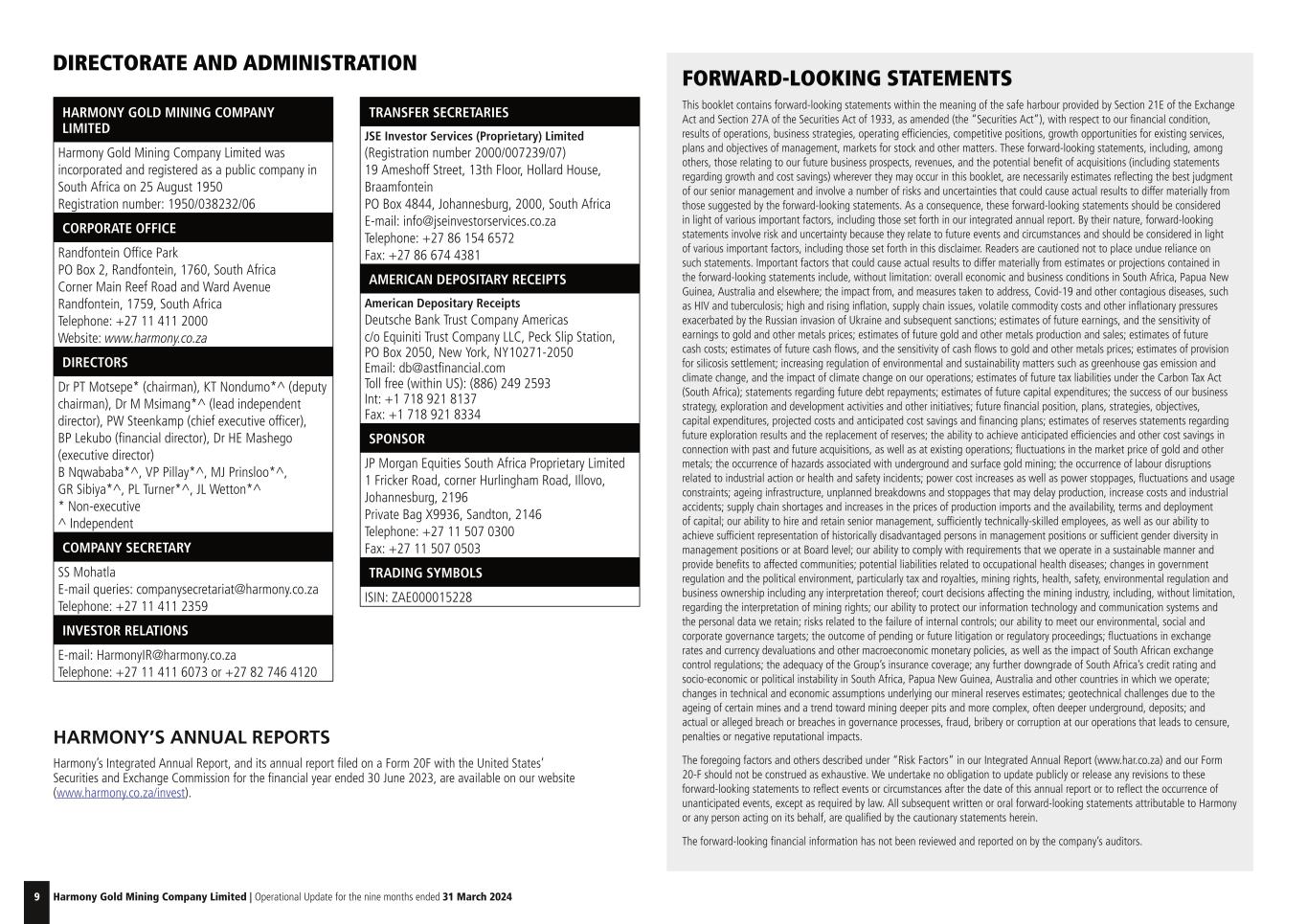 9 Harmony Gold Mining Company Limited | Operational Update for the nine months ended 31 March 2024 FORWARD-LOOKING STATEMENTS This booklet contains forward-looking statements within the meaning of the safe harbour provided by Section 21E of the Exchange Act and Section 27A of the Securities Act of 1933, as amended (the “Securities Act”), with respect to our financial condition, results of operations, business strategies, operating efficiencies, competitive positions, growth opportunities for existing services, plans and objectives of management, markets for stock and other matters. These forward-looking statements, including, among others, those relating to our future business prospects, revenues, and the potential benefit of acquisitions (including statements regarding growth and cost savings) wherever they may occur in this booklet, are necessarily estimates reflecting the best judgment of our senior management and involve a number of risks and uncertainties that could cause actual results to differ materially from those suggested by the forward-looking statements. As a consequence, these forward-looking statements should be considered in light of various important factors, including those set forth in our integrated annual report. By their nature, forward-looking statements involve risk and uncertainty because they relate to future events and circumstances and should be considered in light of various important factors, including those set forth in this disclaimer. Readers are cautioned not to place undue reliance on such statements. Important factors that could cause actual results to differ materially from estimates or projections contained in the forward-looking statements include, without limitation: overall economic and business conditions in South Africa, Papua New Guinea, Australia and elsewhere; the impact from, and measures taken to address, Covid-19 and other contagious diseases, such as HIV and tuberculosis; high and rising inflation, supply chain issues, volatile commodity costs and other inflationary pressures exacerbated by the Russian invasion of Ukraine and subsequent sanctions; estimates of future earnings, and the sensitivity of earnings to gold and other metals prices; estimates of future gold and other metals production and sales; estimates of future cash costs; estimates of future cash flows, and the sensitivity of cash flows to gold and other metals prices; estimates of provision for silicosis settlement; increasing regulation of environmental and sustainability matters such as greenhouse gas emission and climate change, and the impact of climate change on our operations; estimates of future tax liabilities under the Carbon Tax Act (South Africa); statements regarding future debt repayments; estimates of future capital expenditures; the success of our business strategy, exploration and development activities and other initiatives; future financial position, plans, strategies, objectives, capital expenditures, projected costs and anticipated cost savings and financing plans; estimates of reserves statements regarding future exploration results and the replacement of reserves; the ability to achieve anticipated efficiencies and other cost savings in connection with past and future acquisitions, as well as at existing operations; fluctuations in the market price of gold and other metals; the occurrence of hazards associated with underground and surface gold mining; the occurrence of labour disruptions related to industrial action or health and safety incidents; power cost increases as well as power stoppages, fluctuations and usage constraints; ageing infrastructure, unplanned breakdowns and stoppages that may delay production, increase costs and industrial accidents; supply chain shortages and increases in the prices of production imports and the availability, terms and deployment of capital; our ability to hire and retain senior management, sufficiently technically-skilled employees, as well as our ability to achieve sufficient representation of historically disadvantaged persons in management positions or sufficient gender diversity in management positions or at Board level; our ability to comply with requirements that we operate in a sustainable manner and provide benefits to affected communities; potential liabilities related to occupational health diseases; changes in government regulation and the political environment, particularly tax and royalties, mining rights, health, safety, environmental regulation and business ownership including any interpretation thereof; court decisions affecting the mining industry, including, without limitation, regarding the interpretation of mining rights; our ability to protect our information technology and communication systems and the personal data we retain; risks related to the failure of internal controls; our ability to meet our environmental, social and corporate governance targets; the outcome of pending or future litigation or regulatory proceedings; fluctuations in exchange rates and currency devaluations and other macroeconomic monetary policies, as well as the impact of South African exchange control regulations; the adequacy of the Group’s insurance coverage; any further downgrade of South Africa’s credit rating and socio-economic or political instability in South Africa, Papua New Guinea, Australia and other countries in which we operate; changes in technical and economic assumptions underlying our mineral reserves estimates; geotechnical challenges due to the ageing of certain mines and a trend toward mining deeper pits and more complex, often deeper underground, deposits; and actual or alleged breach or breaches in governance processes, fraud, bribery or corruption at our operations that leads to censure, penalties or negative reputational impacts. The foregoing factors and others described under “Risk Factors” in our Integrated Annual Report (www.har.co.za) and our Form 20-F should not be construed