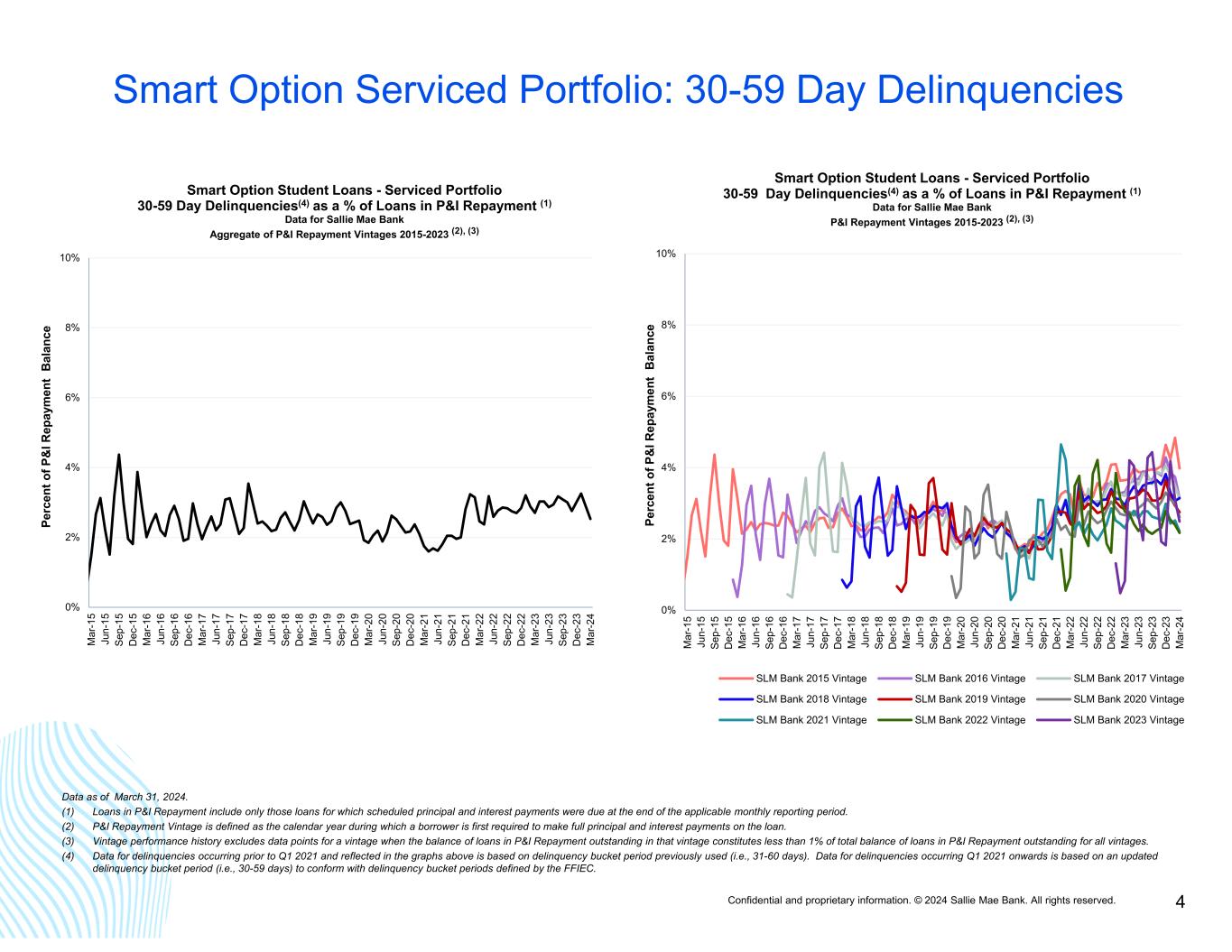 Confidential and proprietary information. © 2024 Sallie Mae Bank. All rights reserved. 3 Important Information Regarding Historical Loan Performance Data Securitization and Sales. In August 2014, Sallie Mae Bank sponsored its first private education loan ABS, SMB Private Education Loan Trust 2014-A (the “SMB 2014-A transaction”). Because this transaction occurred prior to the transfer of loan servicing from Navient to Sallie Mae Bank, Sallie Mae Bank acted as master servicer for the transaction and Navient as subservicer, and the loan pool is serviced pursuant to Navient servicing policies. In April 2015 and October 2015, Sallie Mae Bank sponsored securitizations and residual sales, SMB Private Education Loan Trust 2015-A and SMB Private Education Loan Trust 2015-C, respectively. In the first quarters of 2020 and 2021, Sallie Mae Bank sold $3.1 billion and $3.16 billion, respectively, of Private Education Loans to unaffiliated third parties. In the fourth quarter of 2021, Sallie Mae Bank sold $1.05 billion of private education loans to an unaffiliated third party. In the second quarter of 2022, Sallie Mae Bank sold $2.1 billion of private education loans to an unaffiliated third party. In the third quarter of 2022, Sallie Mae Bank sold $1.0 billion of private education loans to an unaffiliated third party. In the second quarter of 2023, Sallie Mae Bank sold $2.1 billion of private education loans to an unaffiliated third party. In the fourth quarter of 2023, Sallie Mae Bank sold $1.0 billion of private education loans to an unaffiliated third party. In the first quarter of 2024, Sallie Mae Bank sold $2.10 billion of private education loans to an unaffiliated third party. Sallie Mae Bank also sponsored on-balance sheet term securitizations as follows: Sallie Mae Bank services the loans in all of the securitizations it has sponsored following the SMB 2014-A transaction. Types of Smart Option Student Loan Portfolio Data TransactionDateTransactionDateTransactionDate SMB Private Education Loan Trust 2021-DAugust 2021SMB Private Education Loan Trust 2018-BJune 2018SMB Private Education Loan Trust 2015-BJuly 2015 SMB Private Education Loan Trust 2021-ENovember 2021SMB Private Education Loan Trust 2018-CSeptember 2018SMB Private Education Loan Trust 2016-AMay 2016 SMB Private Education Loan Trust 2022-CAugust 2022SMB Private Education Loan Trust 2019-AMarch 2019SMB Private Education Loan Trust 2016-BJuly 2016 SMB Private Education Loan Trust 2023-AMarch 2023SMB Private Education Loan Trust 2019-BJune 2019SMB Private Education Loan Trust 2016-COctober 2016 SMB Private Education Loan Trust 2023-CAugust 2023SMB Private Education Loan Trust 2020-AFebruary 2020SMB Private Education Loan Trust 2017-AFebruary 2017 SMB Private Education Loan Trust 2020-BAugust 2020SMB Private Education Loan Trust 2017-BNovember 2017 SMB Private Education Loan Trust 2021-BMay 2021SMB Private Education Loan Trust 2018-AMarch 2018 Smart Option Student Loan Portfolio Data for Sallie Mae Bank Serviced Loans. Information in this category is presented for loans in the 2015-2023 P&I Repayment Vintages originated under the Smart Option Student Loan program regardless of whether the loan is currently held by an ABS trust or another third party. All loans in this category are serviced by Sallie Mae Bank. Data in this category is used in the tables below under the following headings: • “30-59 Day Delinquencies as a Percentage of Loans in P&I Repayment;” • “60-89 Day Delinquencies as a Percentage of Loans in P&I Repayment;” • “90-plus Day Delinquencies as a Percentage of Loans in P&I Repayment;” In relation to cumulative defaults, the Sallie Mae Bank Serviced portfolio data provides insight into gross defaults of the Smart Option Student Loans covered and serviced by Sallie Mae Bank since 2015. We believe historical loan performance data could be representative of the expected performance of Smart Option Student Loans to be included in new Sallie Mae Bank trusts. Sallie Mae Bank currently charges off loans at the end of the month in which they reach 120 days delinquent or otherwise when the loans are classified as a loss by us or our regulator. In the tables noted below, information is presented for loans originated in 2015-2023 under the Smart Option Student Loan program regardless of whether the loan is currently held by an ABS trust or another third party. All loans in this category are serviced by Sallie Mae Bank. Data in this category is used in the tables below under the following headings: • “Voluntary Constant Prepayment Rates by Disbursement Vintage and Product;” and • “Total Constant Prepayment Rates by Disbursement Vintage and Product.” This Smart Option Student Loan portfolio data provides insight into historical prepayment rates specifically of the Smart Option Student Loans covered. Any data or other information presented in the following charts is for comparative purposes only and is not to be deemed a part of any offering of securities. • “Forbearance as a Percentage of Loans in P&I Repayment and Forbearance;” • “Annualized Gross Defaults as a Percentage of Loans in P&I Repayment;” and • “Cumulative Defaults by P&I Repayment Vintage and Years Since First P&I Repayment Period.”